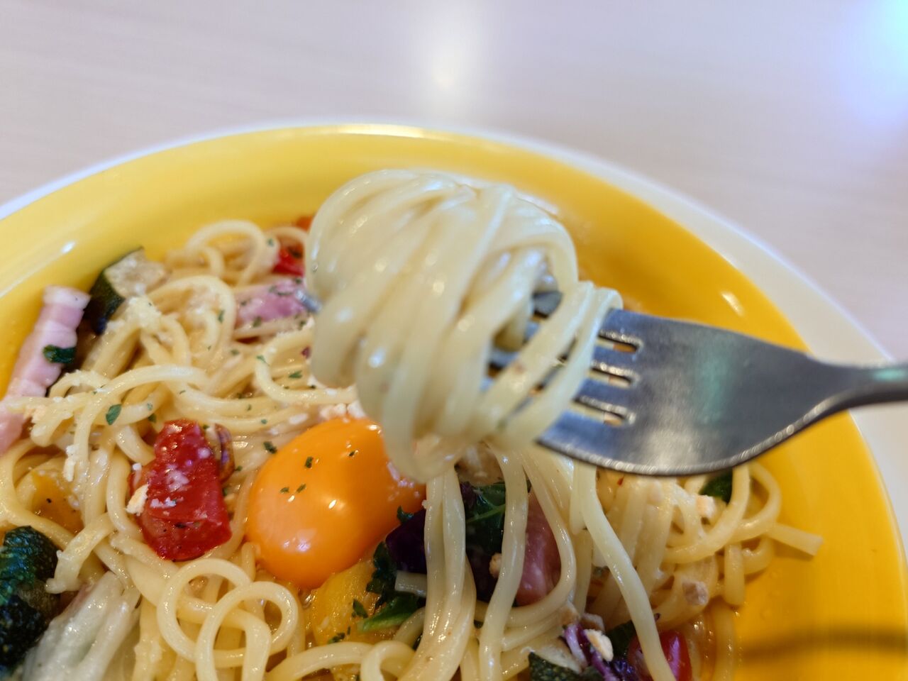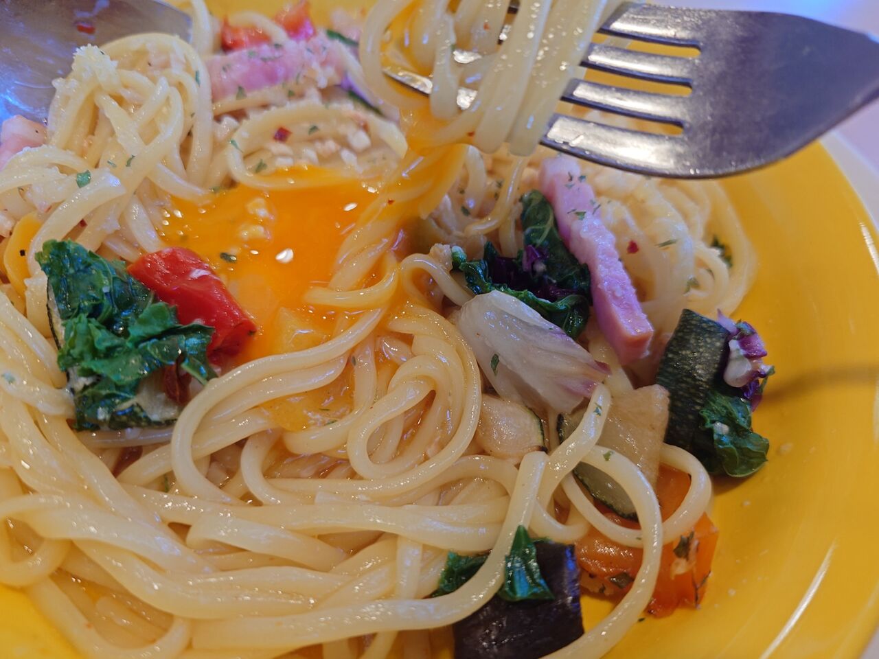 途中で、黄身を割って絡ませたら、ちょっとクリーム的な要素がプラスされました。