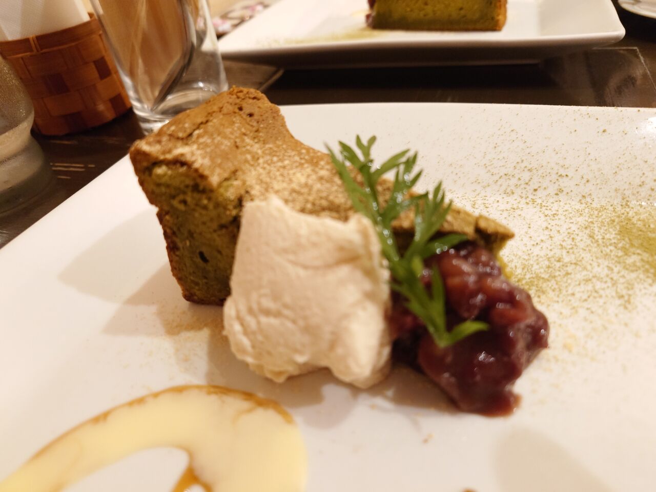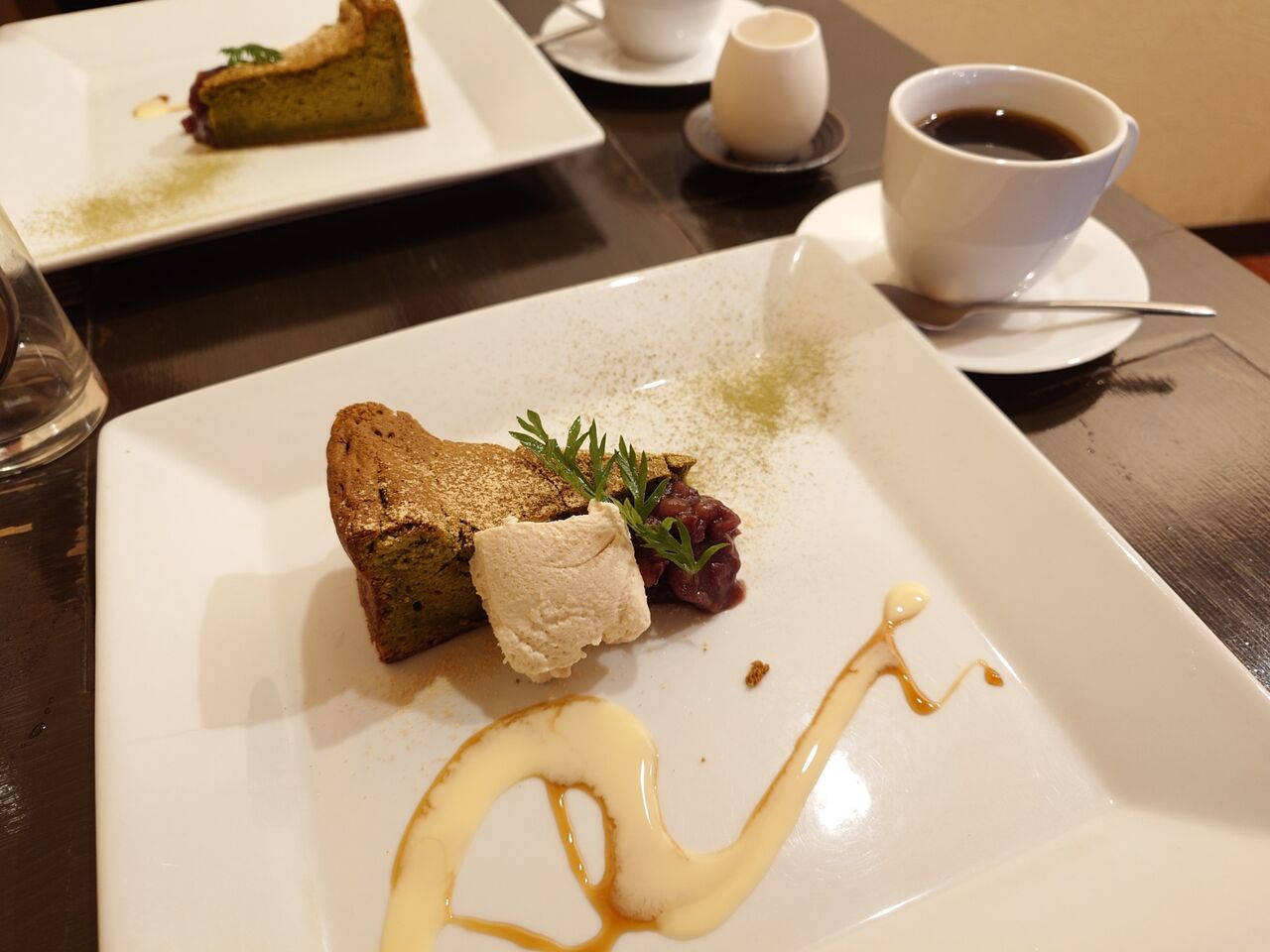 しっかり抹茶のお味のガトーショコラに、黒蜜のムースと、あんこが添えられていました。