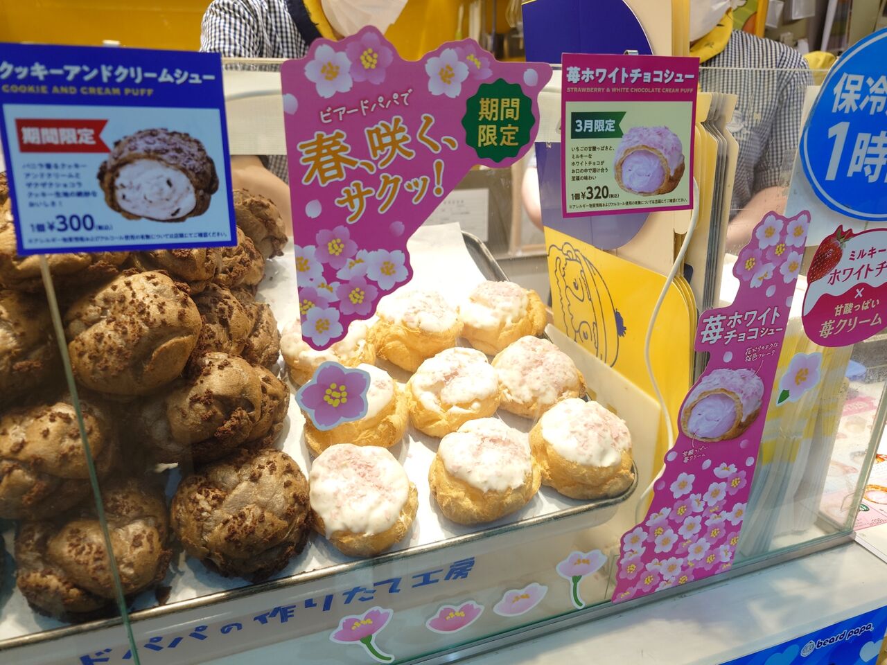 春らしいPOPに囲まれた〈苺ホワイトチョコシュー〉¥320。
