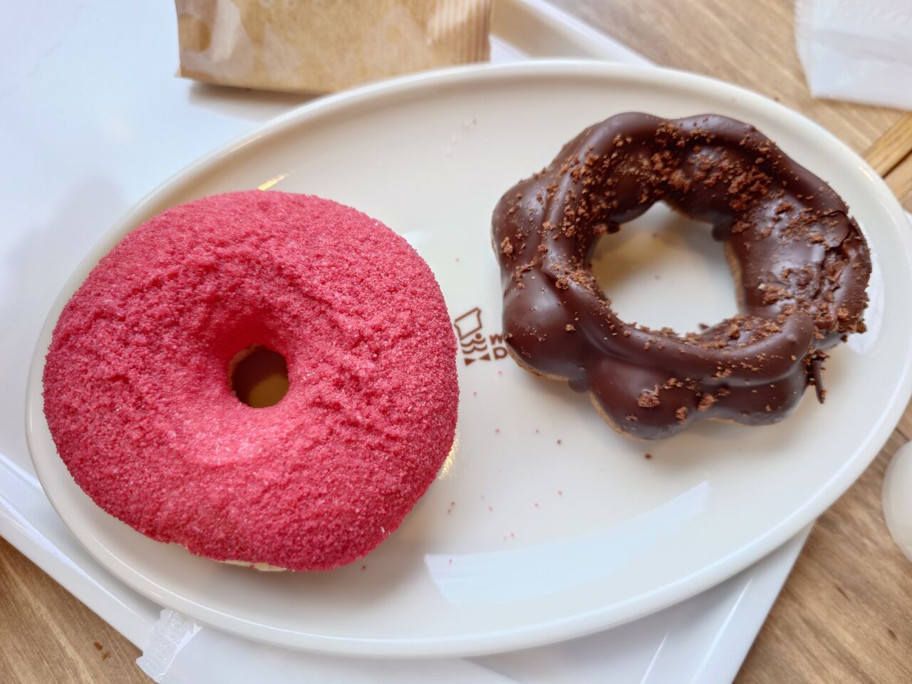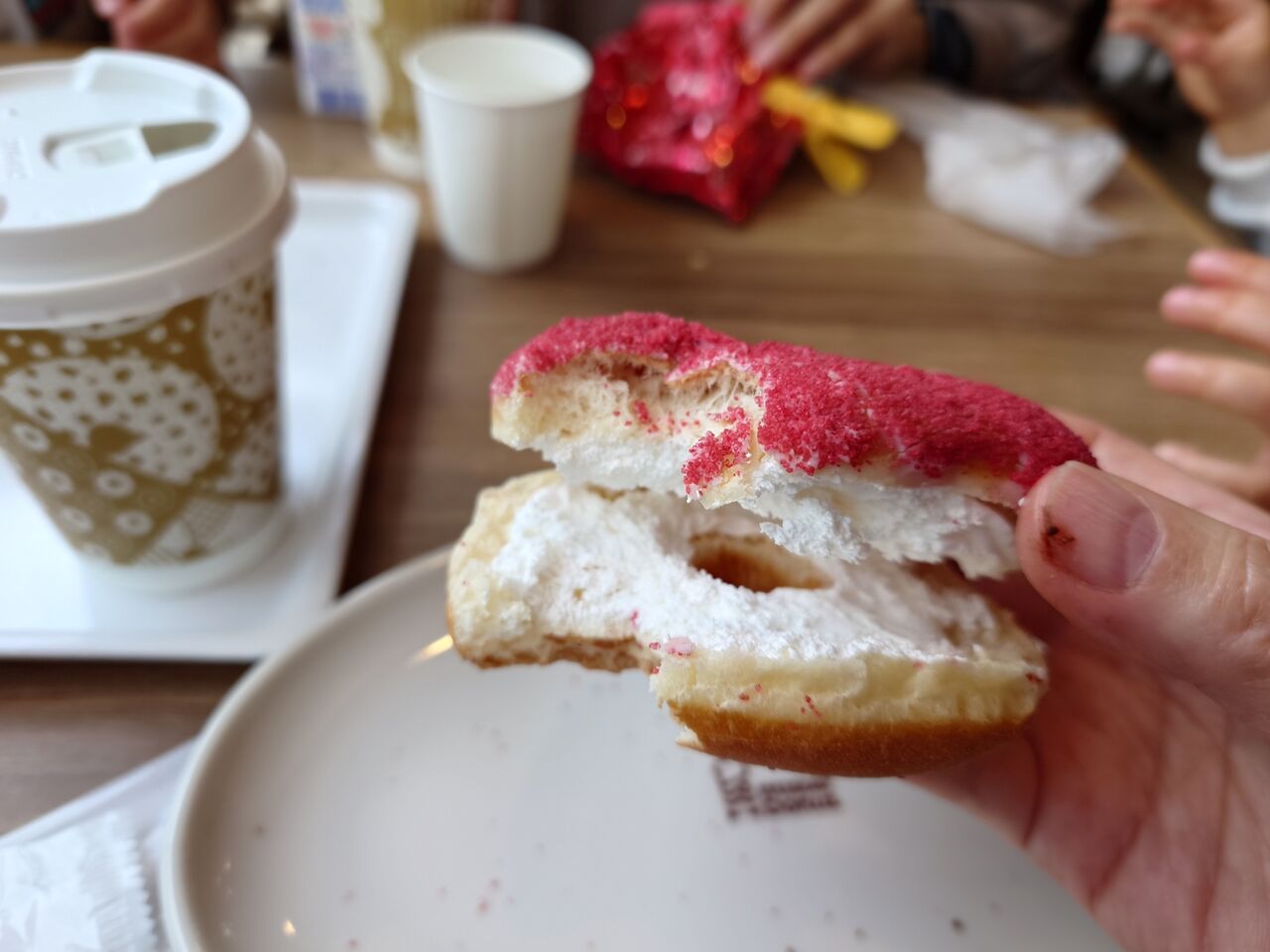 私は左側のダブルストロベリー&ホイップリング。こんなに赤くていいんですか?ていうくらい赤い〜!