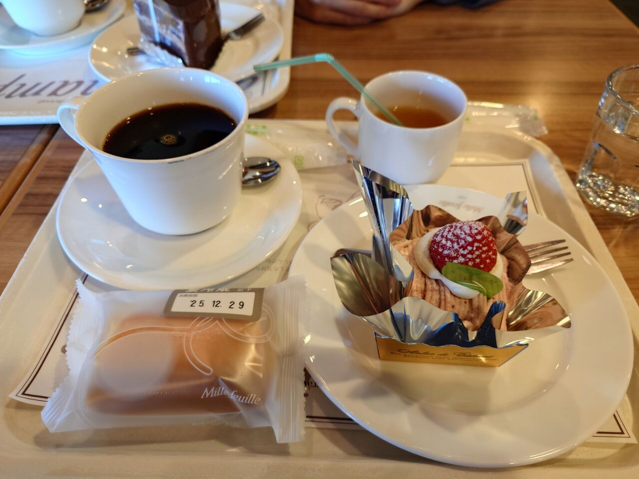 ケーキの向こう側にあるのがキッズリンゴジュースで、コーヒーの手前にあるのが、Tomくんの〈天使のほっぺ〉です。