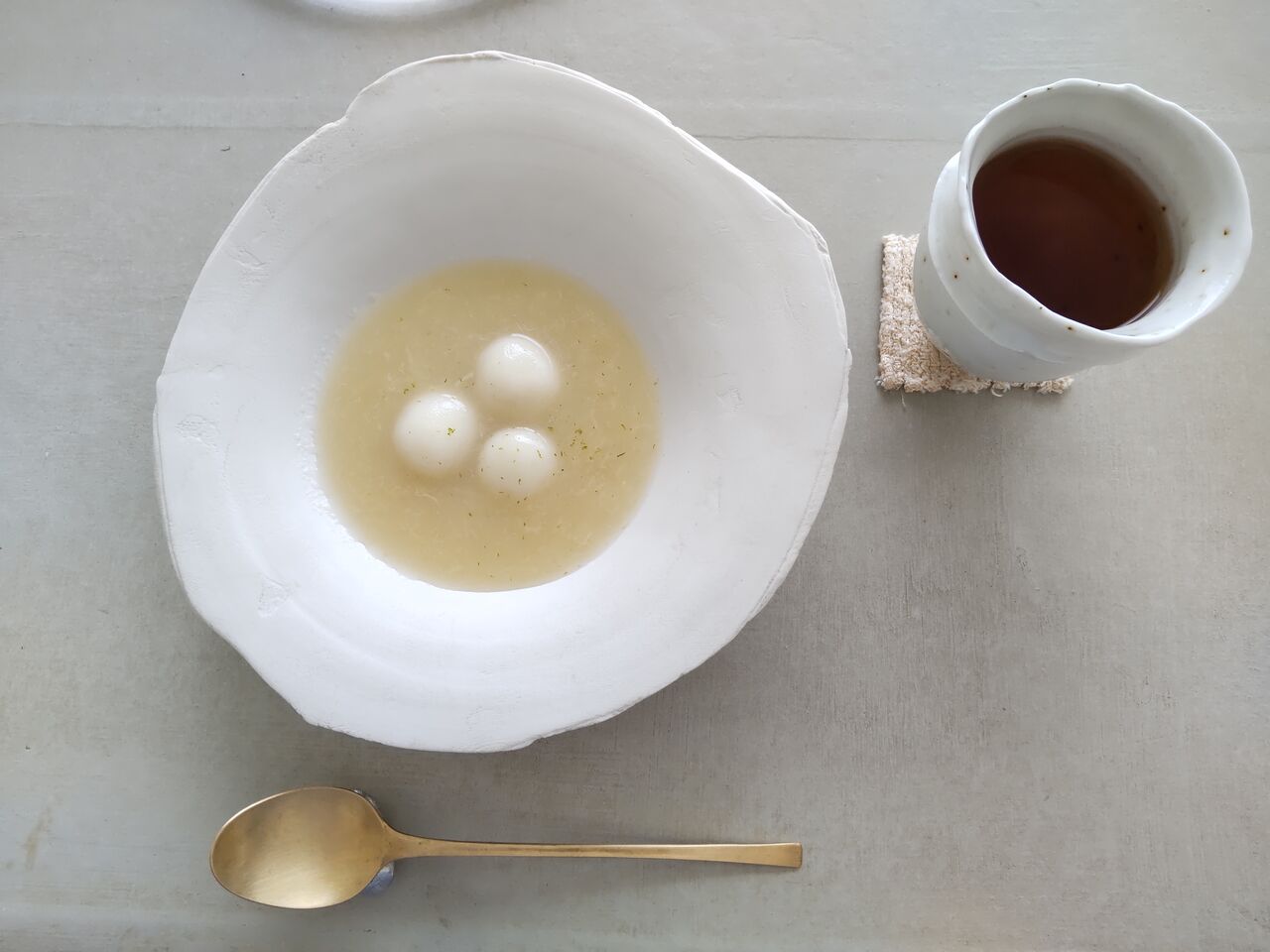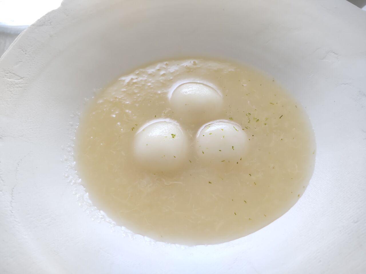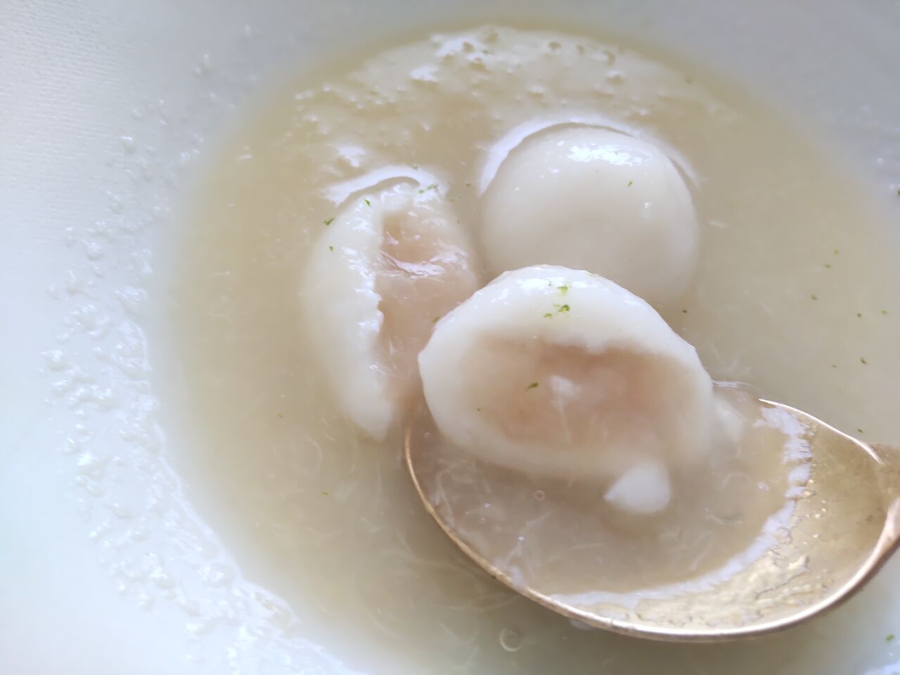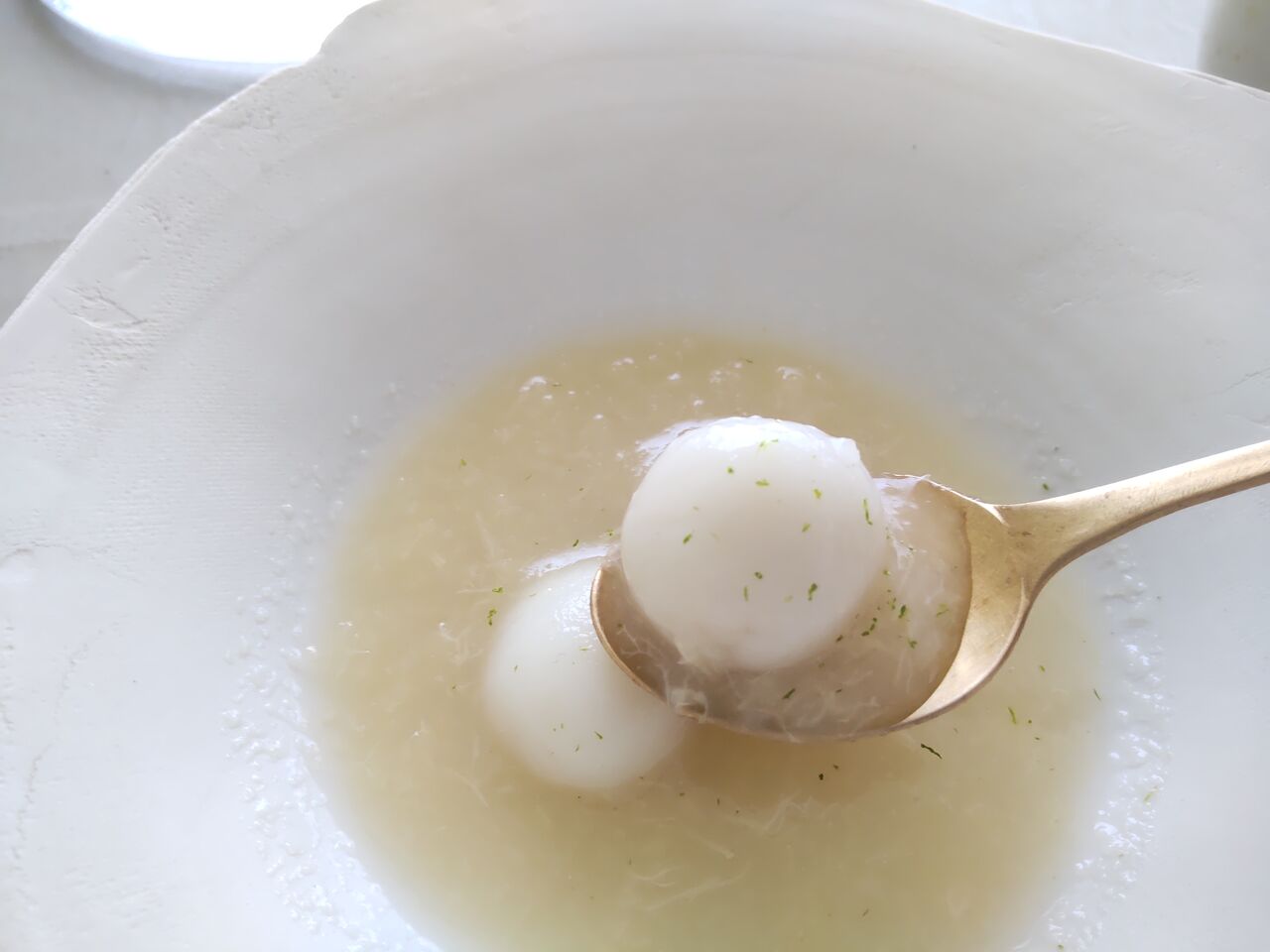 桃の冷やし汁粉に決めてはいたのですが、このビジュアルしか知らなかったので、白あんのお汁粉なのかしら・・・???どうなのかしら???て感じでしたが、ベースは桃のソースでした。