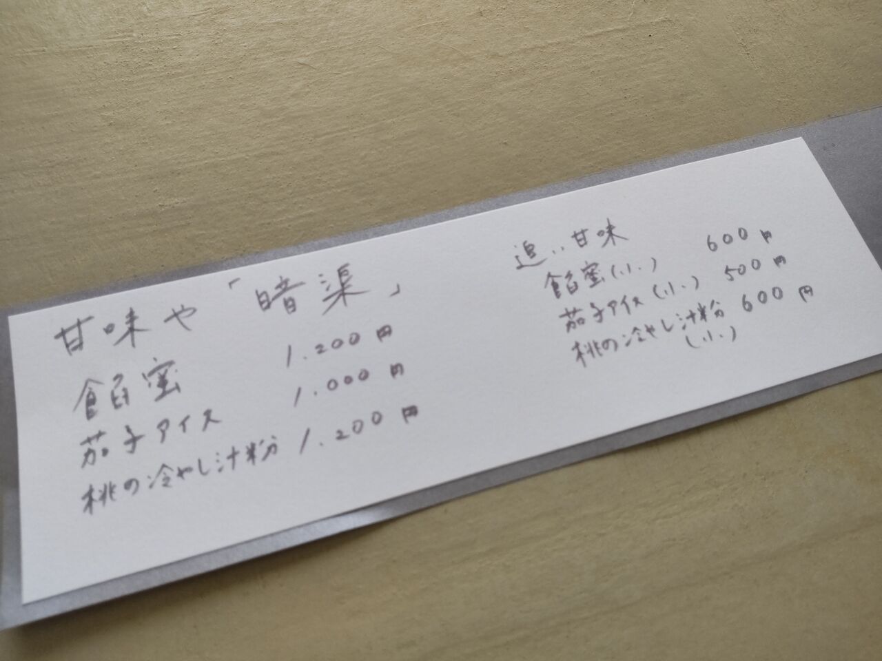 さてさて、甘味は、餡蜜、茄子アイス、桃の冷やし汁粉の3種類というのは、インスタを見て知っていましたが、おかわりの追い甘味があることは、行ってみて初めて知りました。