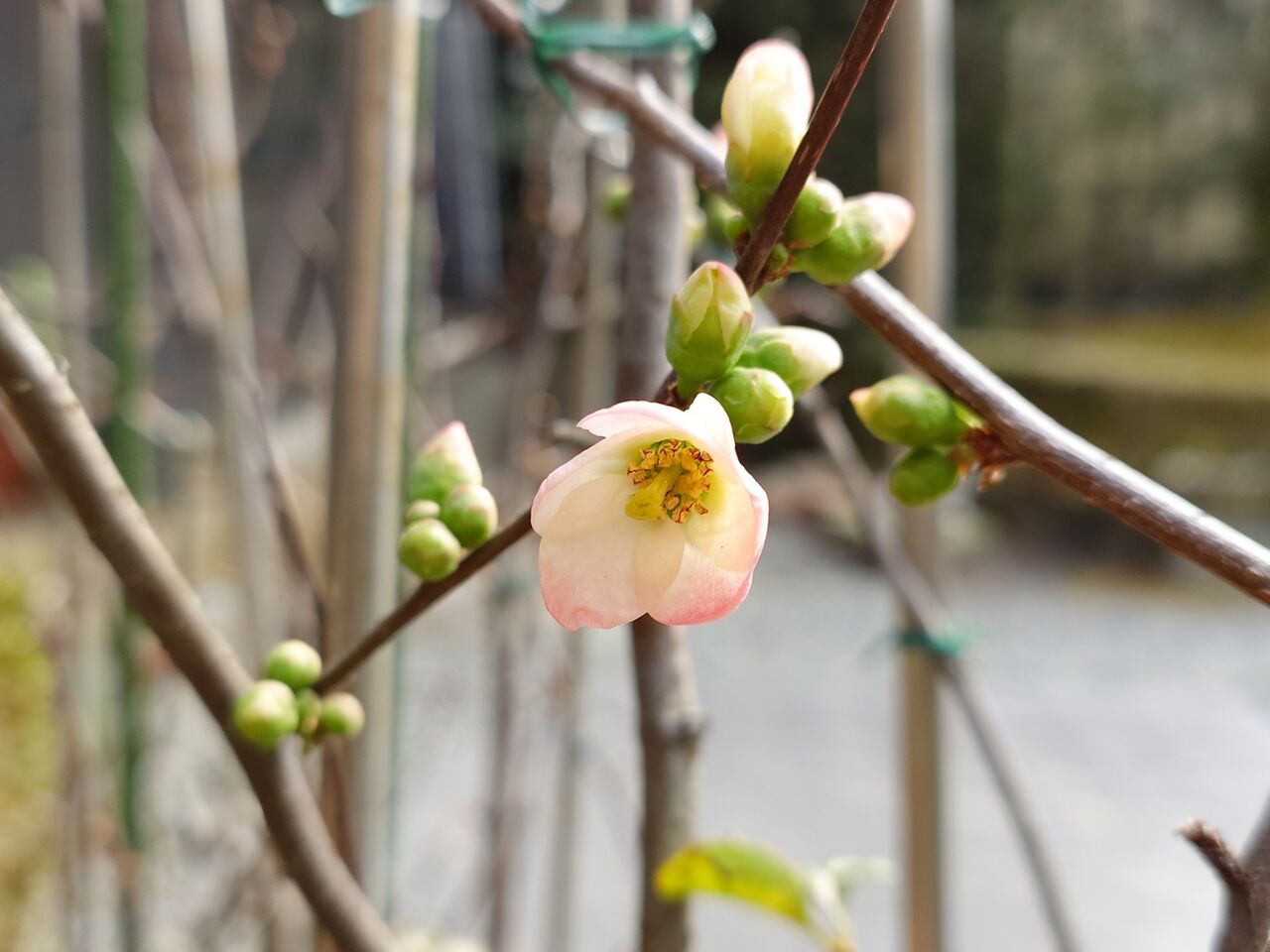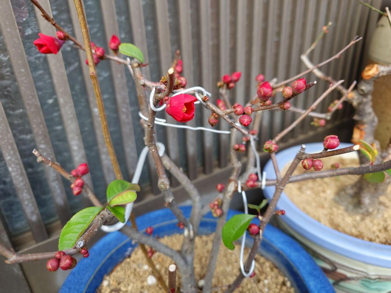 いつもは、梅が咲いてから咲き始めるというボケの花が先に咲き始めてます。