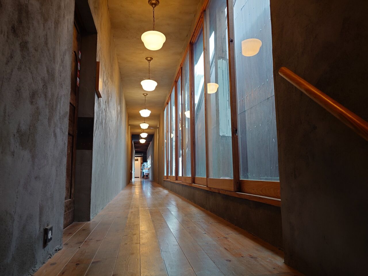 開いているドアから建物の中に入り、1階の廃虚のようなツミキ食堂あとをながめつつ階段を上がると、ズーンと長い廊下があります。