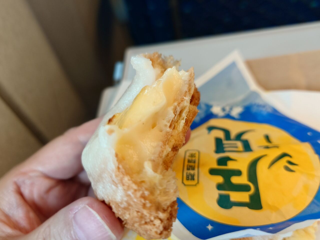 白い部分は、薄く伸ばしたお餅で、真ん中はカスタードクリームです。