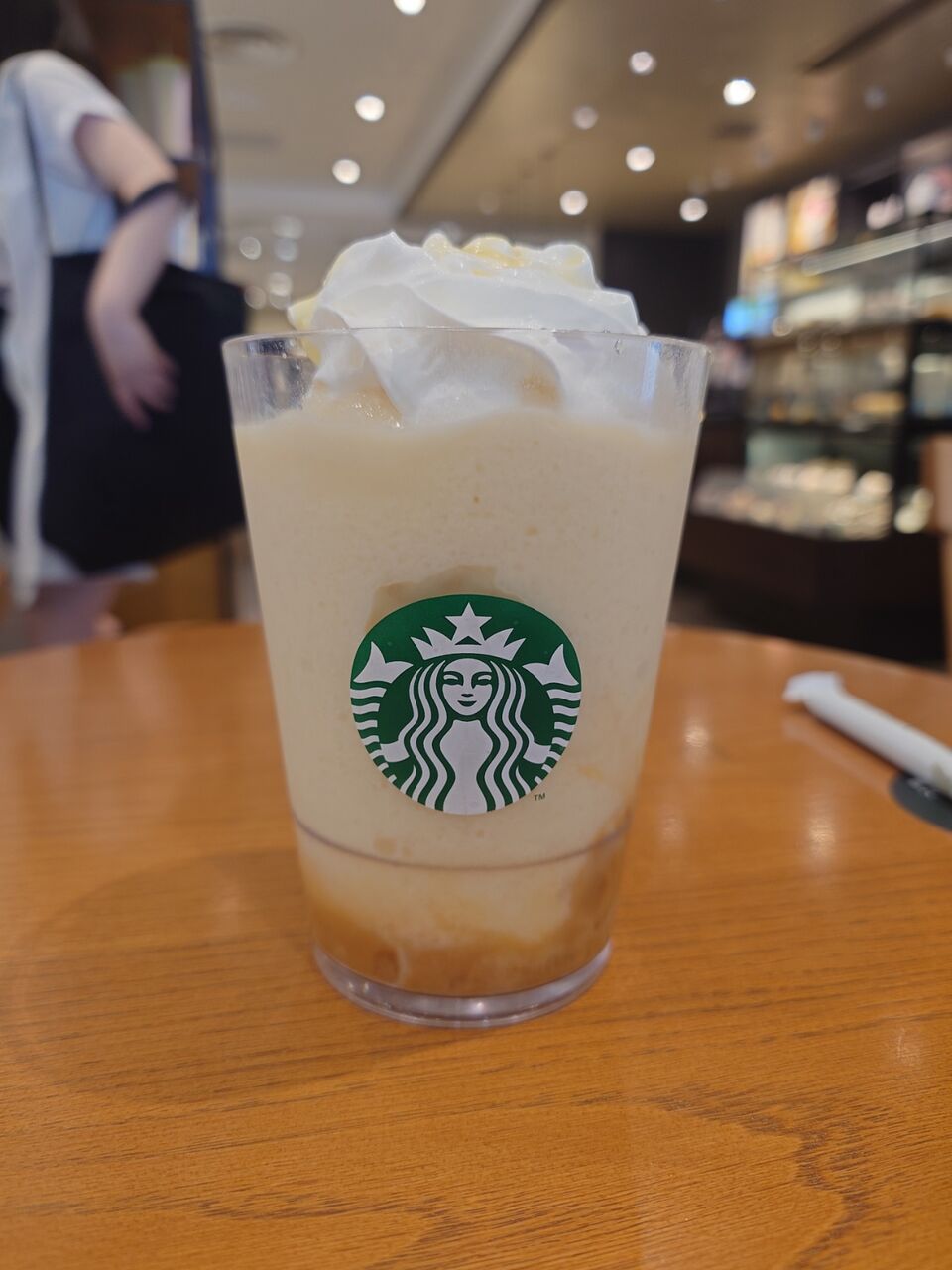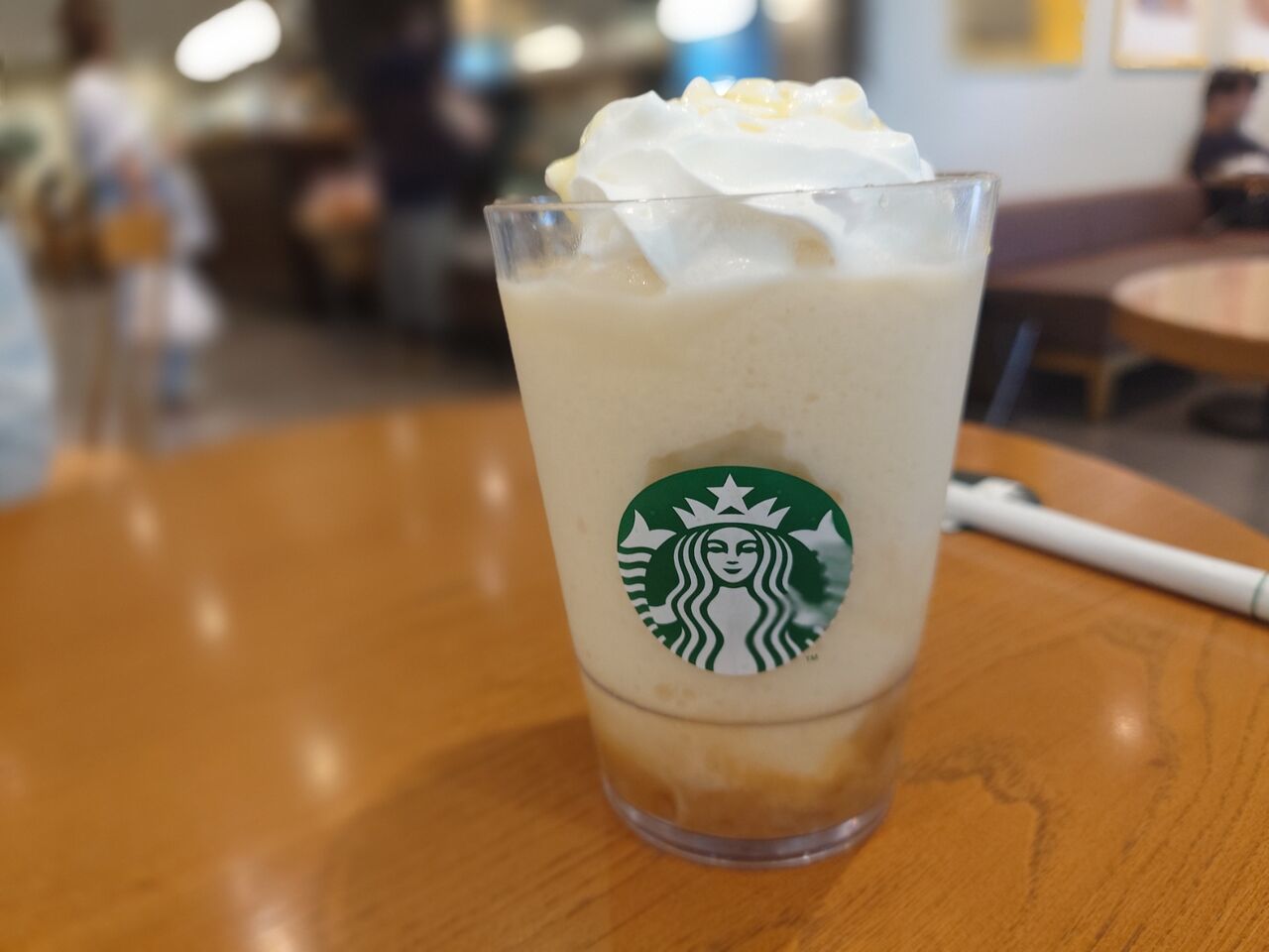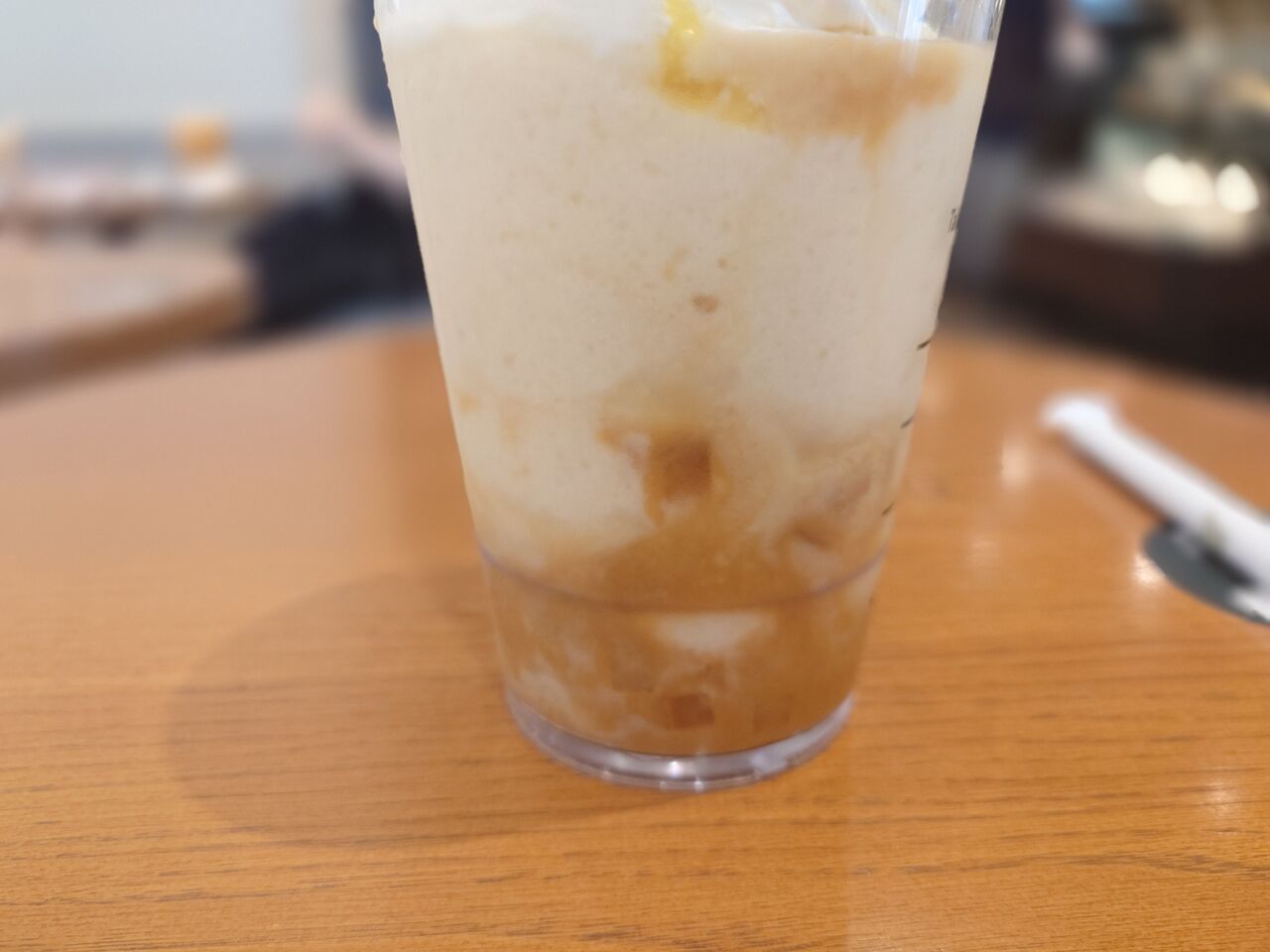 キャラメルと洋梨のフラペチーノを混ぜ合わせながら飲んでいきます。