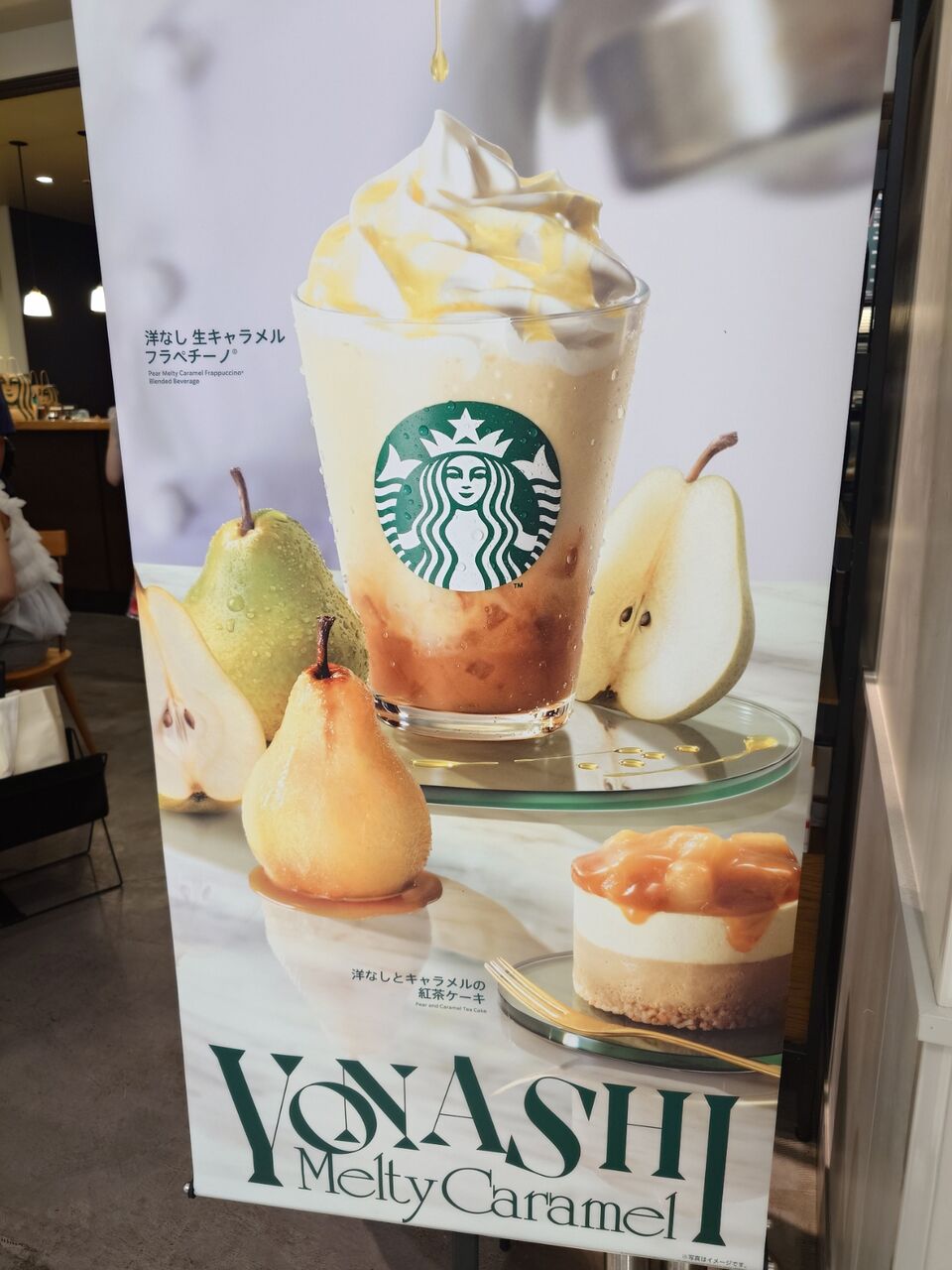 〈洋なし 生キャラメル フラペチーノ〉と〈洋なしキャラメル紅茶のケーキ〉が出ています。