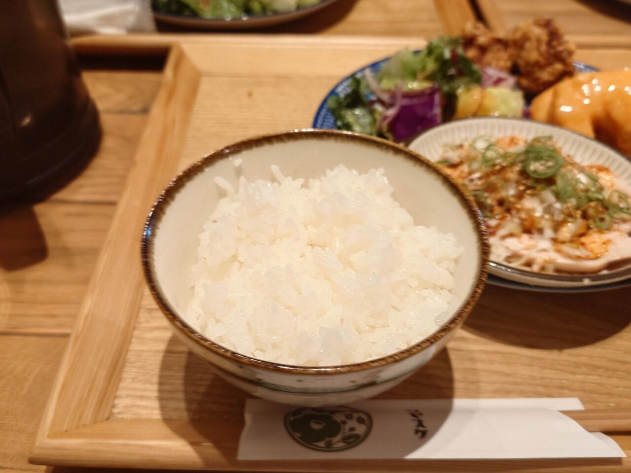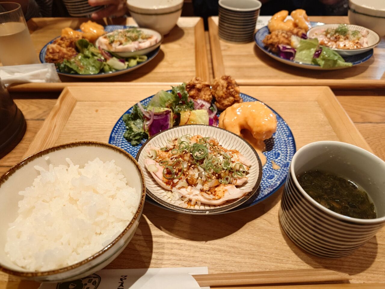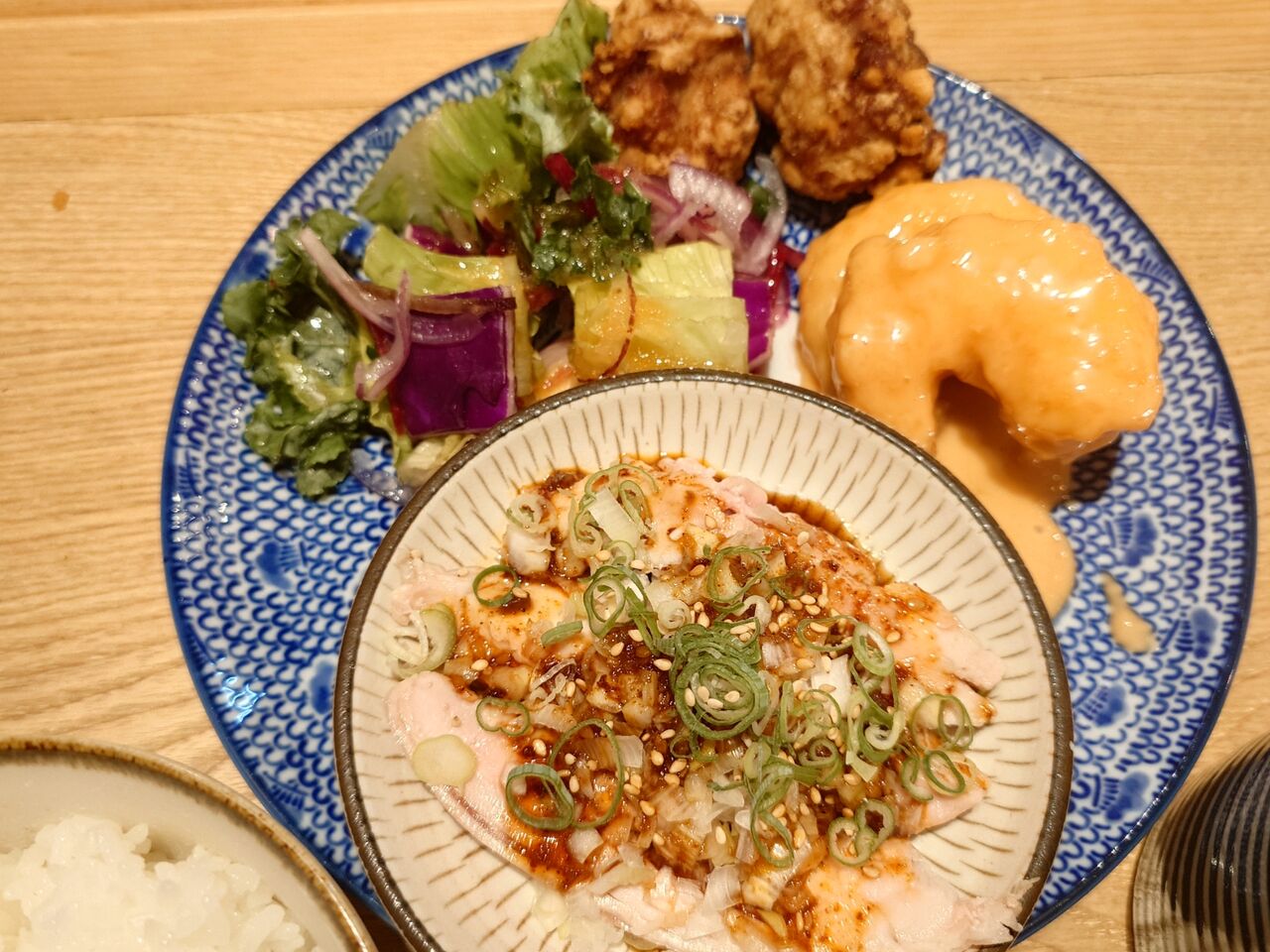 奥はサラダと唐揚げ?中華のはずなので、油淋鶏かな。揚げたてで熱々でした。