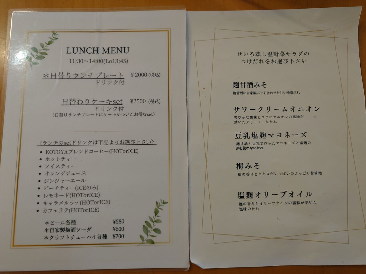 ランチは、日替わりランチプレート(ドリンク付き)¥2000か、プラスケーキの¥2500のどちらかになります。