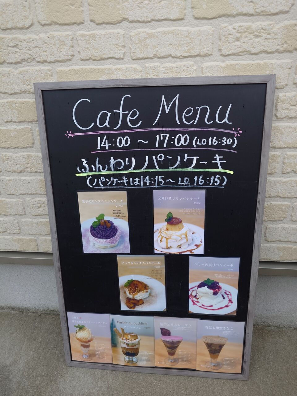 カフェメニューのパンケーキやパフェの写真があまりにも魅力的で、足を止める人たちがいっぱいいます。