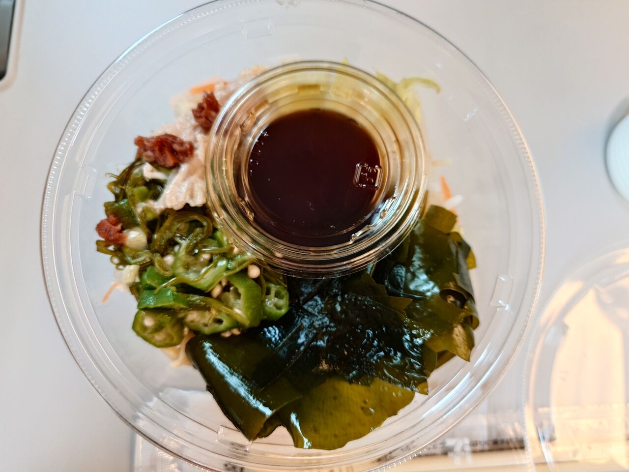 オクラにメカブが混ぜ込まれ、ねばねば感がアップ。蒸し鶏はほんの一切れだけど、まぁよいよい。