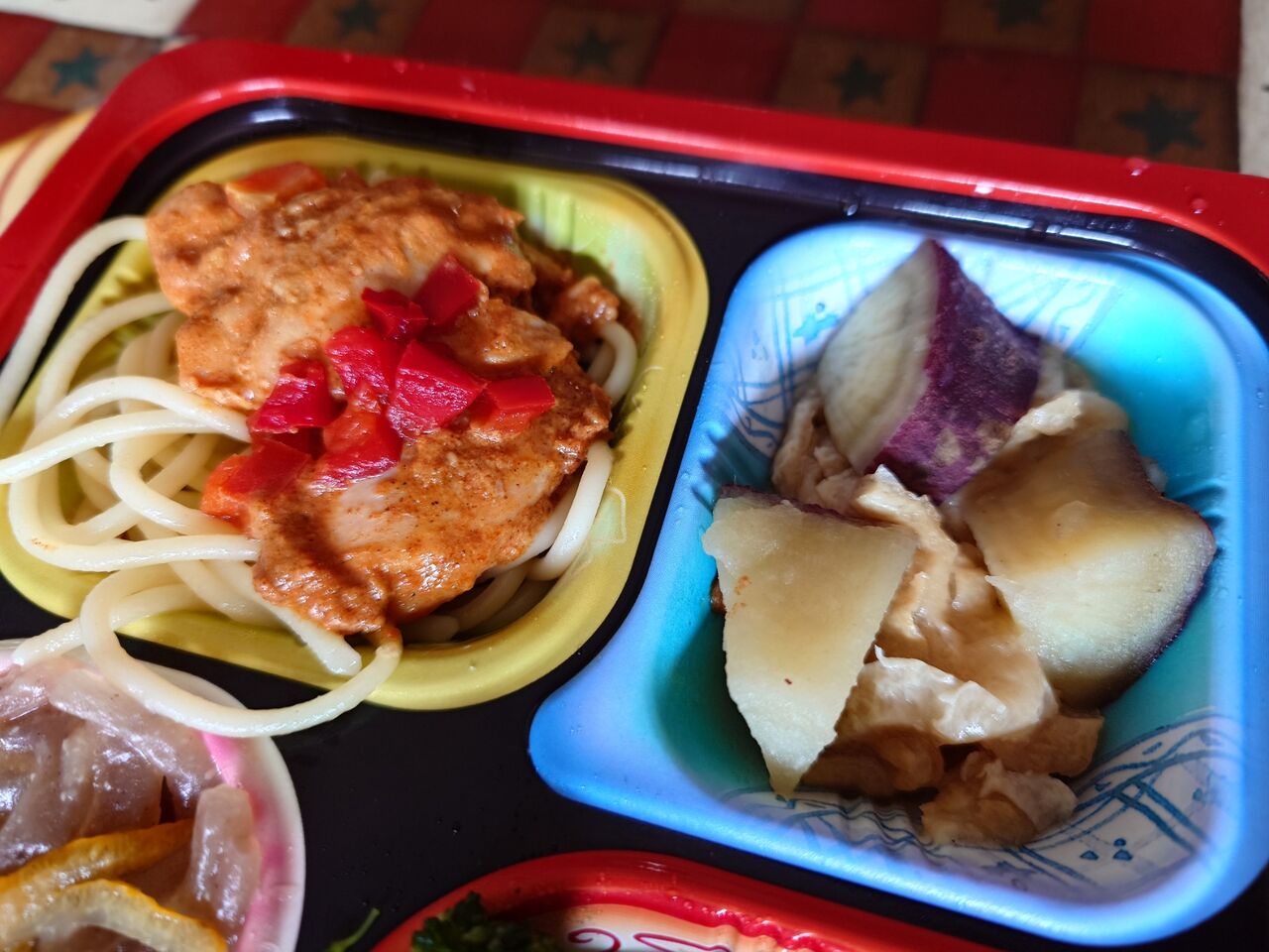 パスタの上にタンドリーチキン、さつま芋のなにか・・・