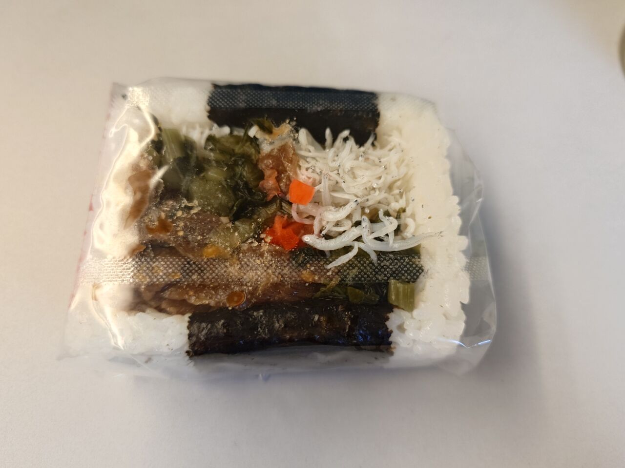 遠州灘産のしらすと野沢菜(たぶん)もごはんにあいます。とてもおいしい〈おに弁〉でした。