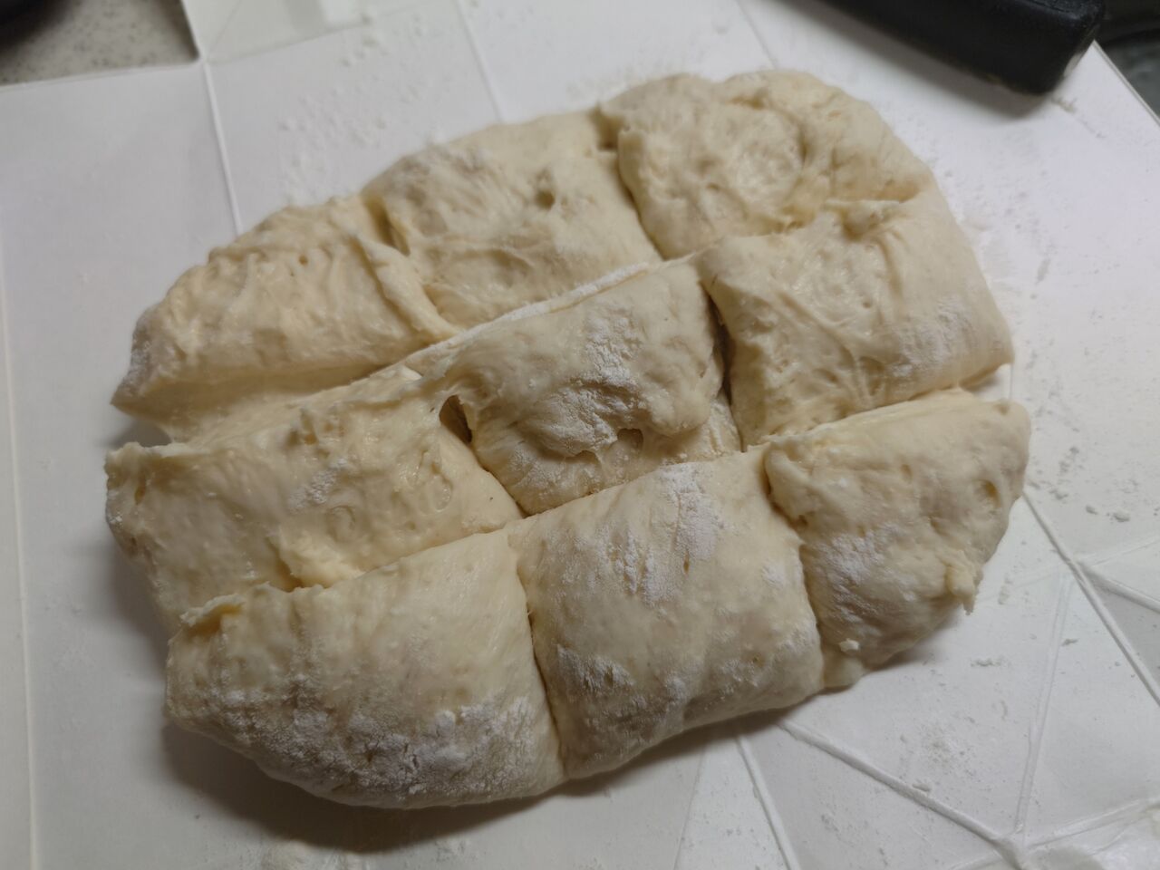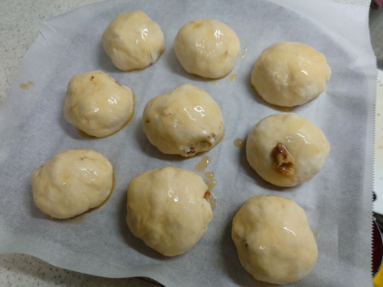 ⑥プチパンにするので、くるみを入れて9等分にだいたいカット