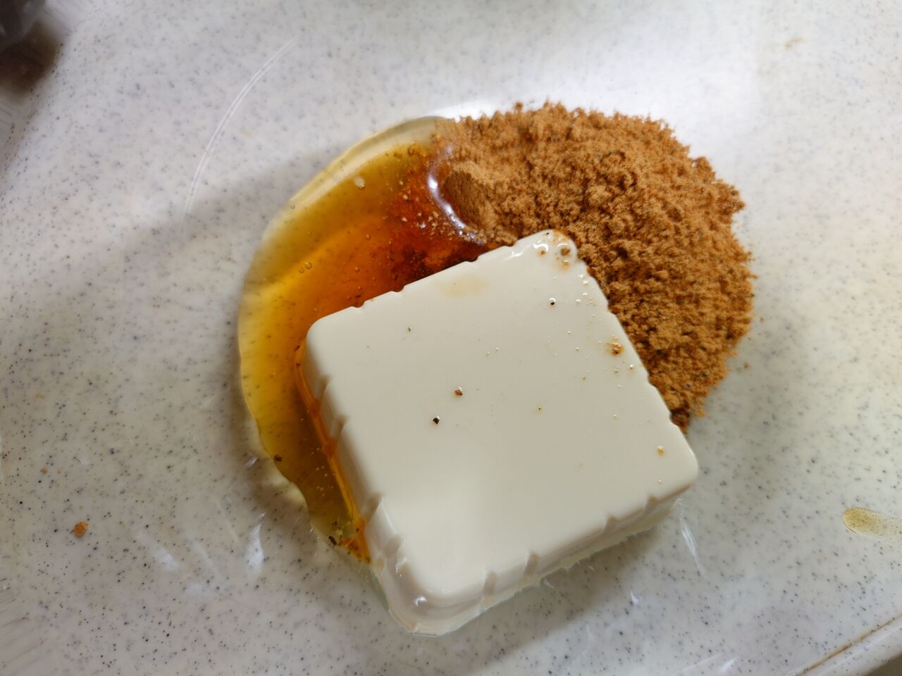 お豆腐の味はしません。私は普通のきな粉ではなく、黒ごまきな粉を使っているので、こげ茶色になっています。