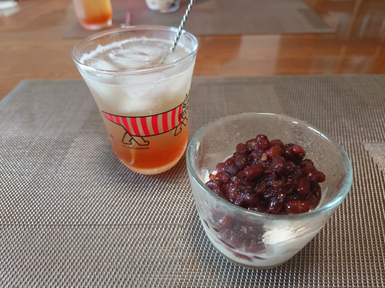 デザートは、アイスクリームに自家製あずきをかけたものに、梅シロップの炭酸割りです。