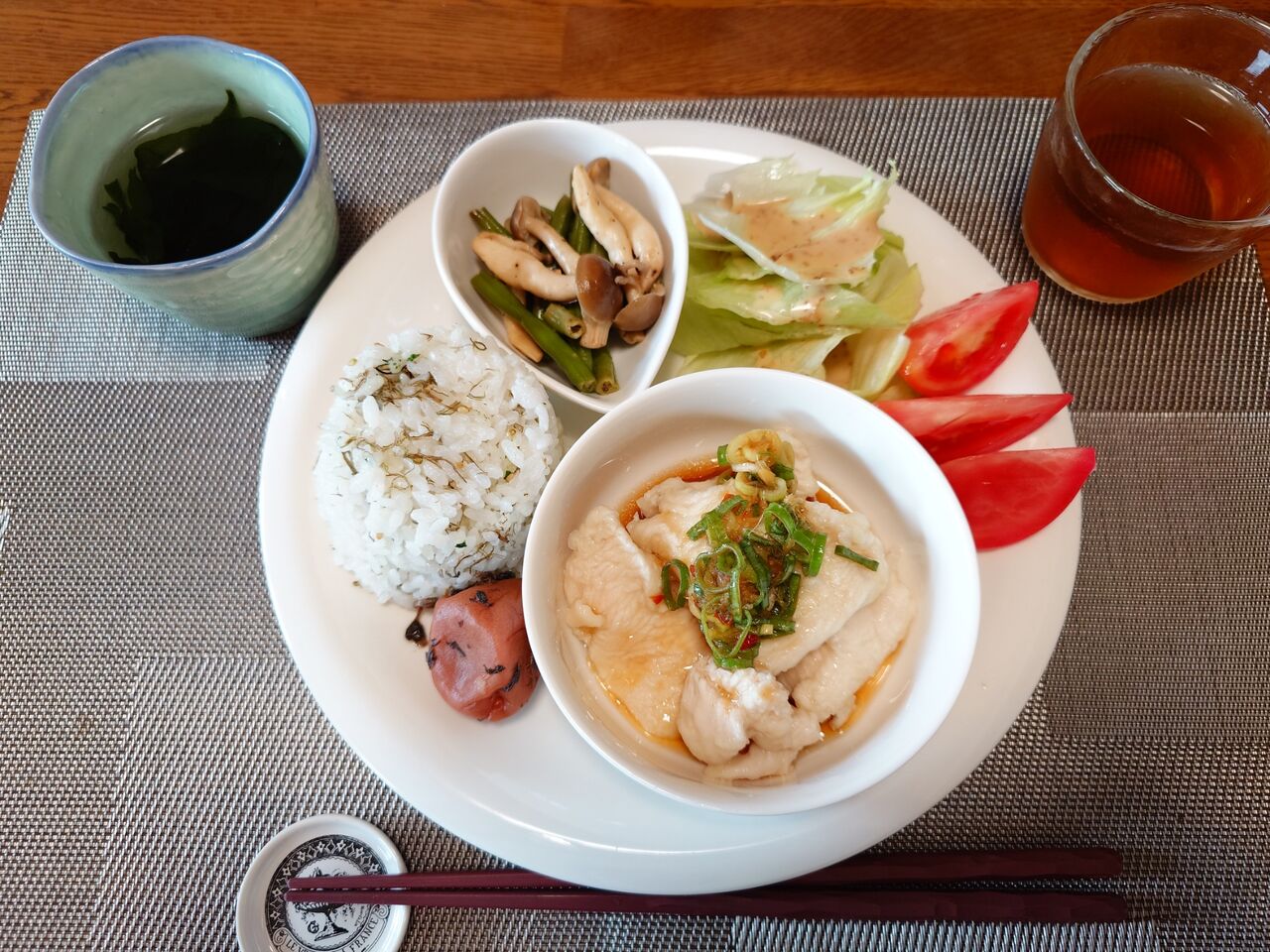 今日はおにぎりを作る手間を省いて、自家製しそ梅干しのせごはんにしました。