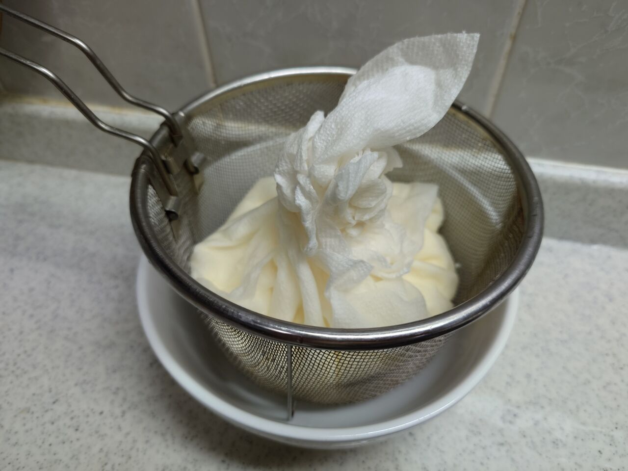 ザルに二重にしたキッチンペーパーを敷いてヨーグルトを入れます。