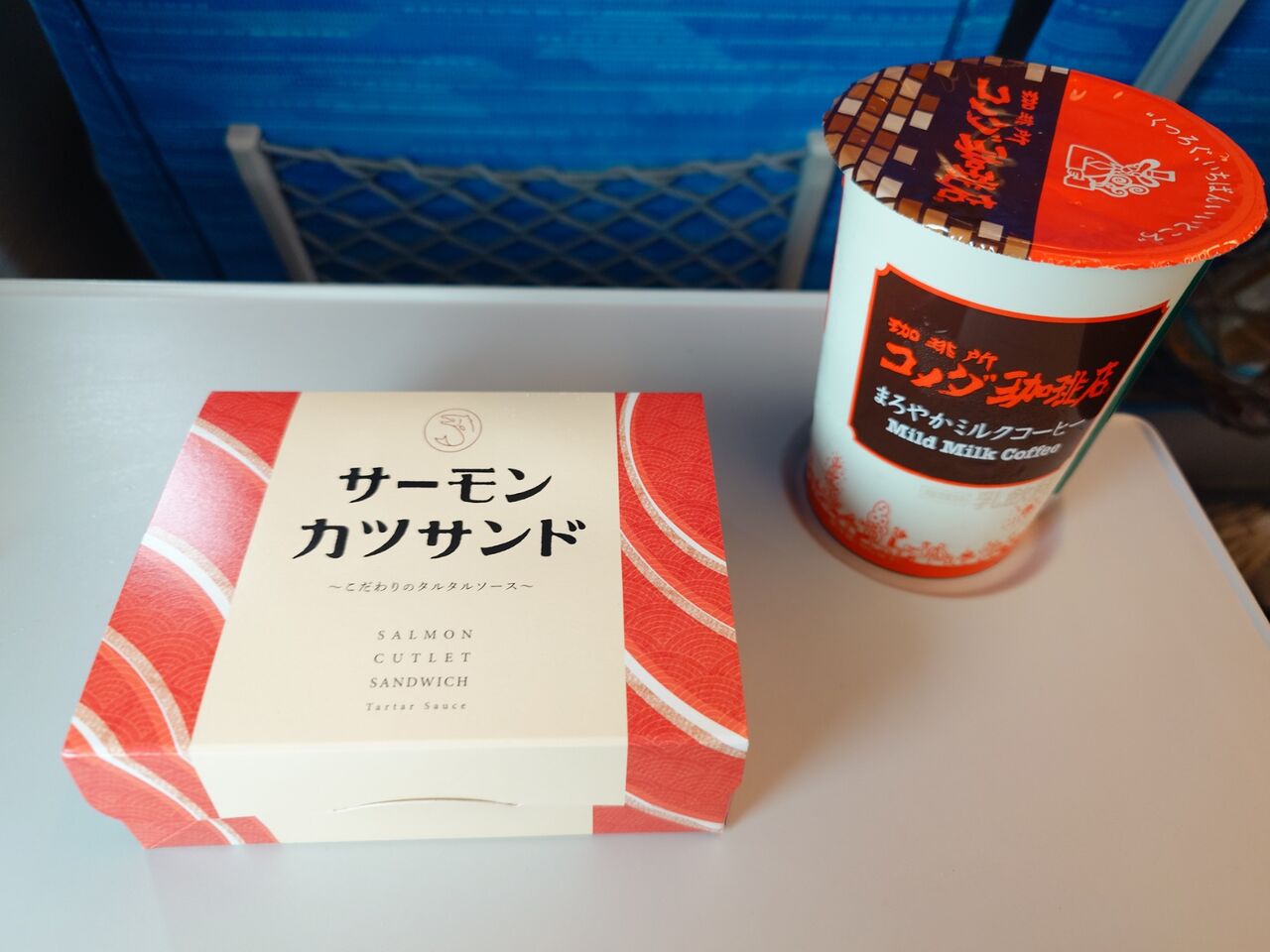 というわけで、サーモンカツサンドと売店で購入したコメダのまろやかミルクコーヒーです。