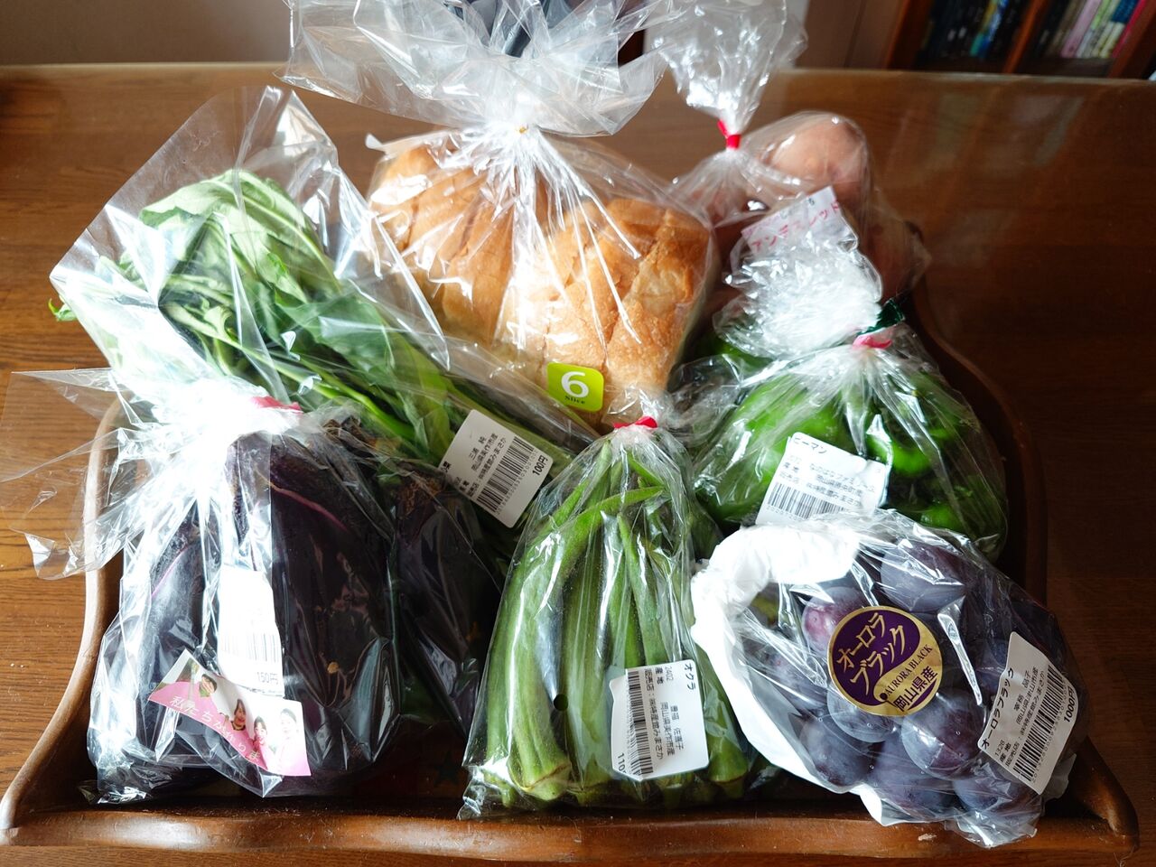 空芯菜、ナス、オクラ、ピーマン、じゃがいも、オーロラブラック、食パン。