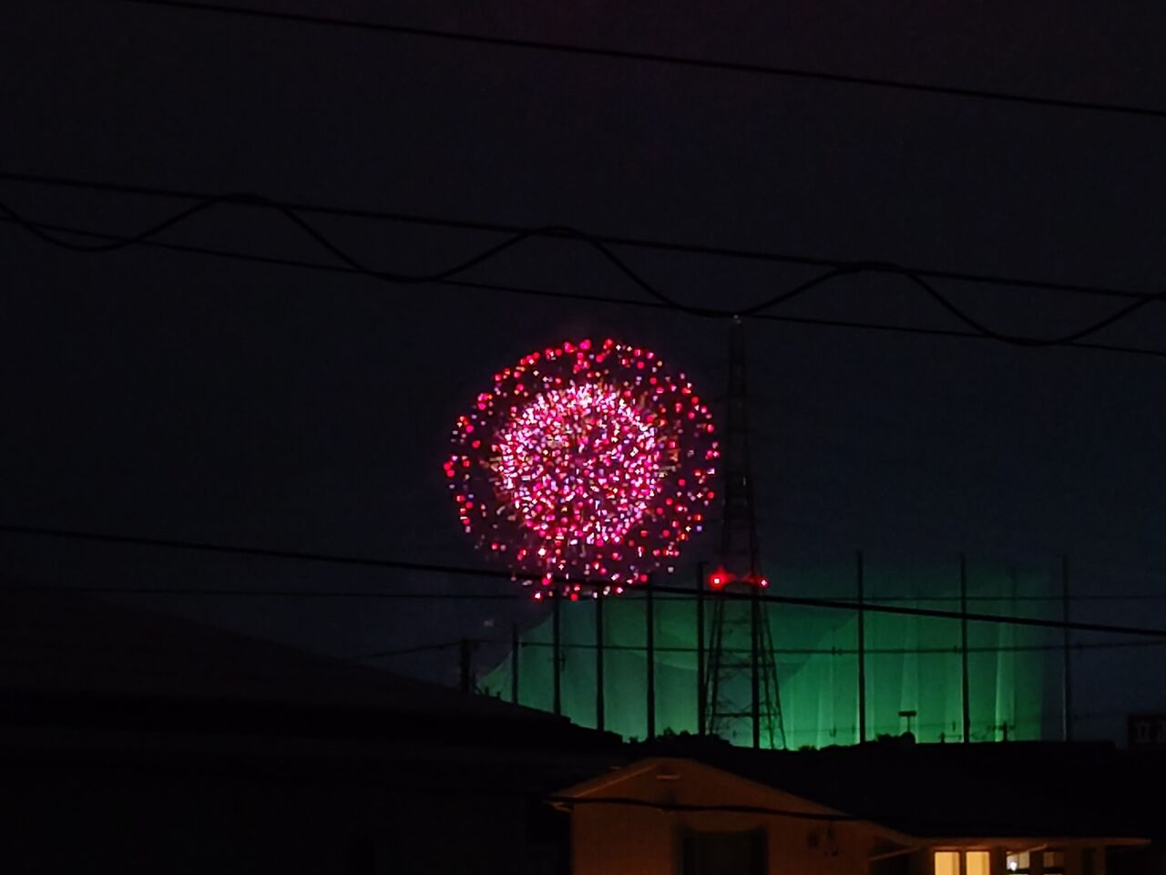今夜は少し離れたところで花火大会があり、2階の窓から見えました。