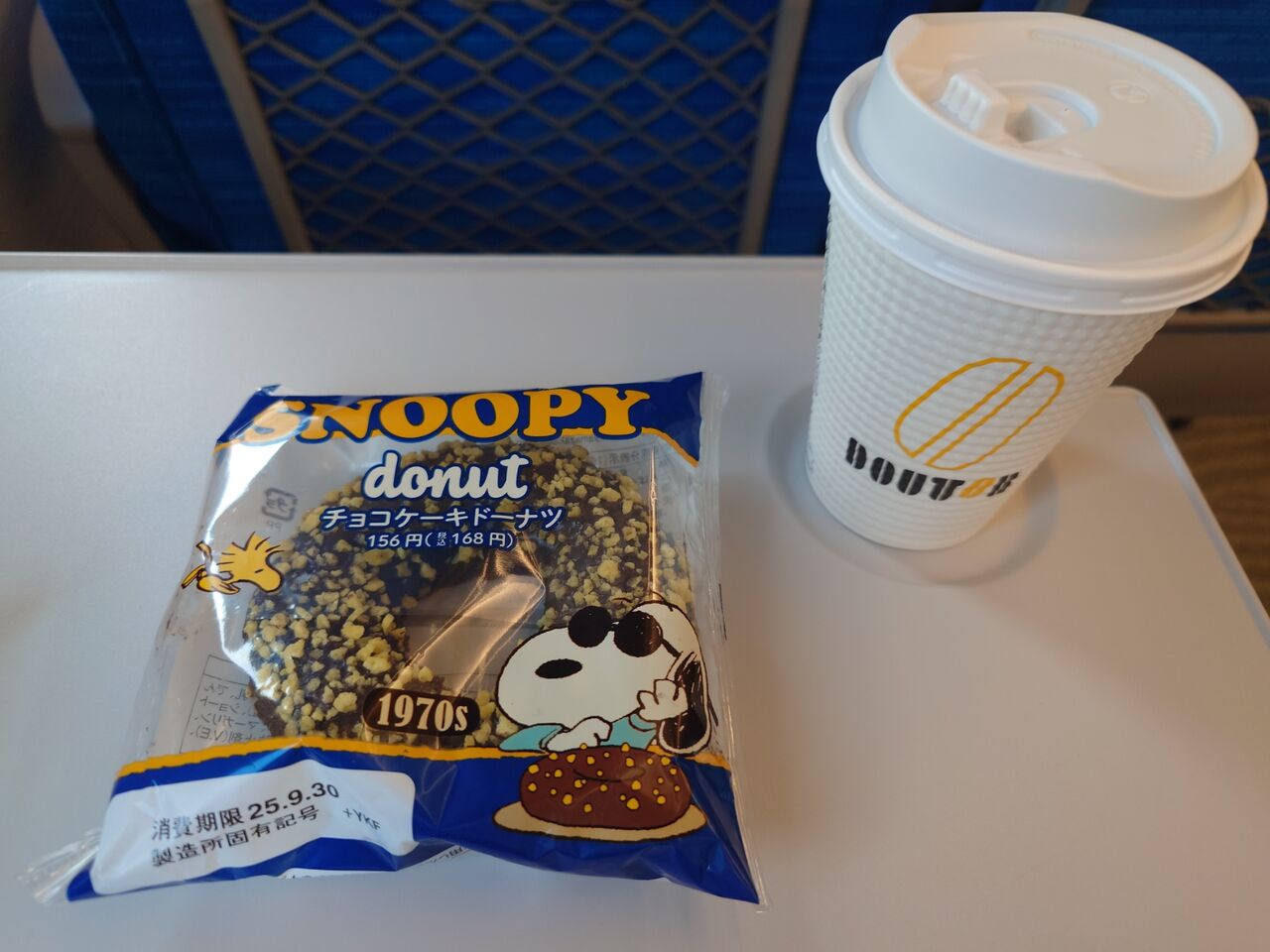 というわけで、新幹線のおやつは、前から気になっていたファミマのスヌーピードーナツ。