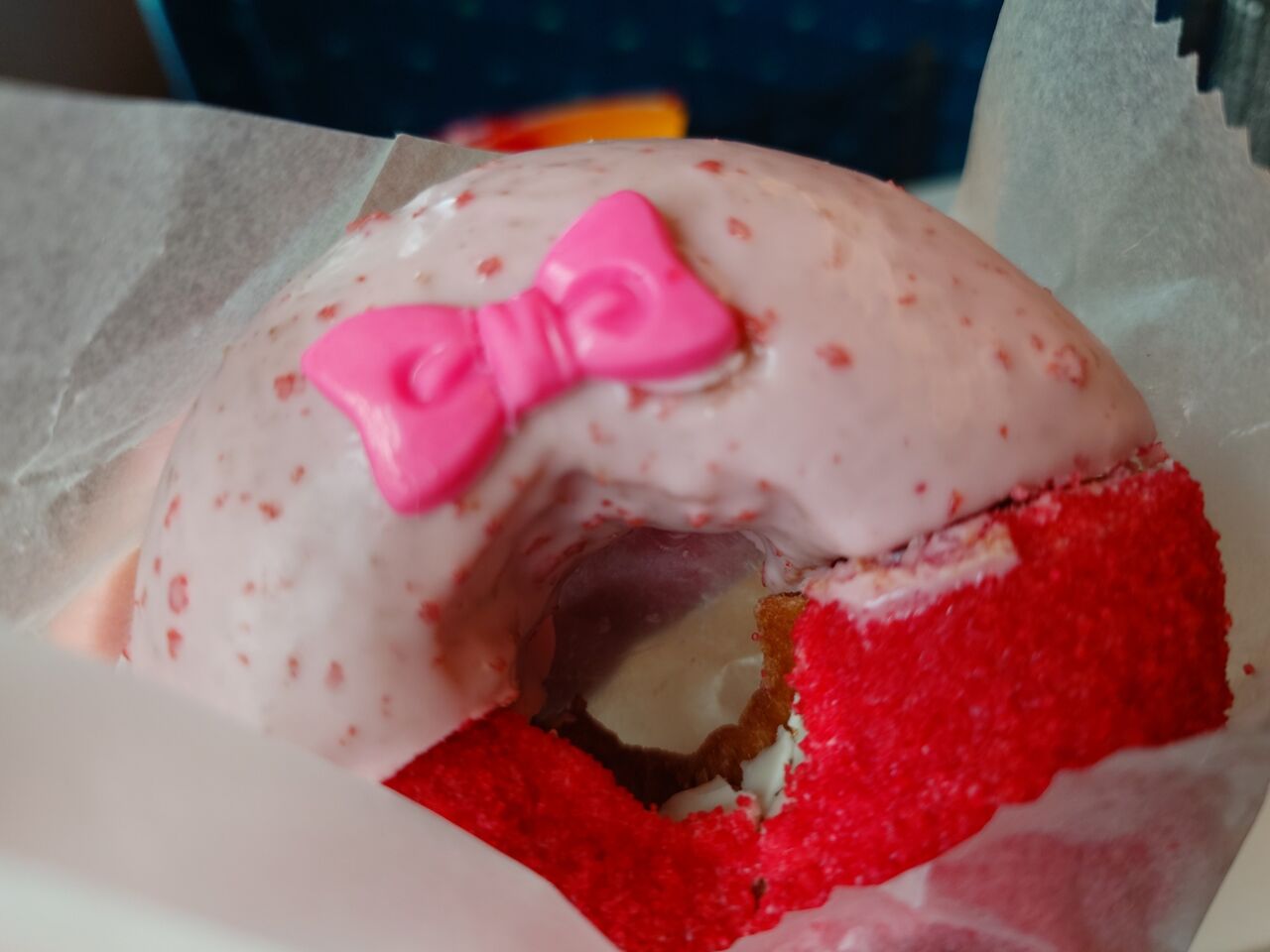 キャラメルフレーバーのシュードーナツ生地にストロベリーチョコをコーティング。赤いのはりんごシュガーのようです。