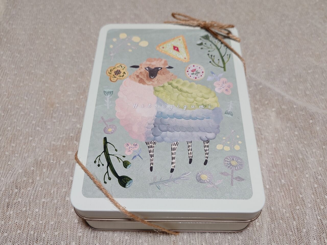 ちょっと不思議な雰囲気を持つ羊のイラストが描かれた「ひつじ組」のクッキー缶です。