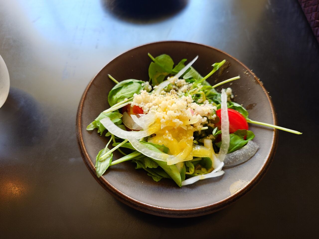 また、サラダは、らせん状の薄切りの大根ときゅうりと枝豆。よくある葉物サラダと違っておもしろいです。