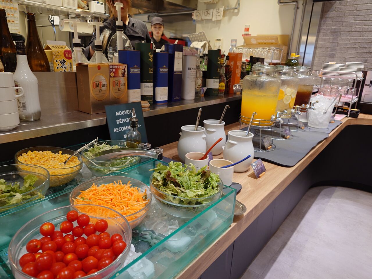 ソフトドリンクは、オレンジジュースやデトックスウォーター、紅茶(ティーバッグ数種類)、コーヒーなどがあり、その隣に、フレッシュ野菜のサラダコーナーがあります。