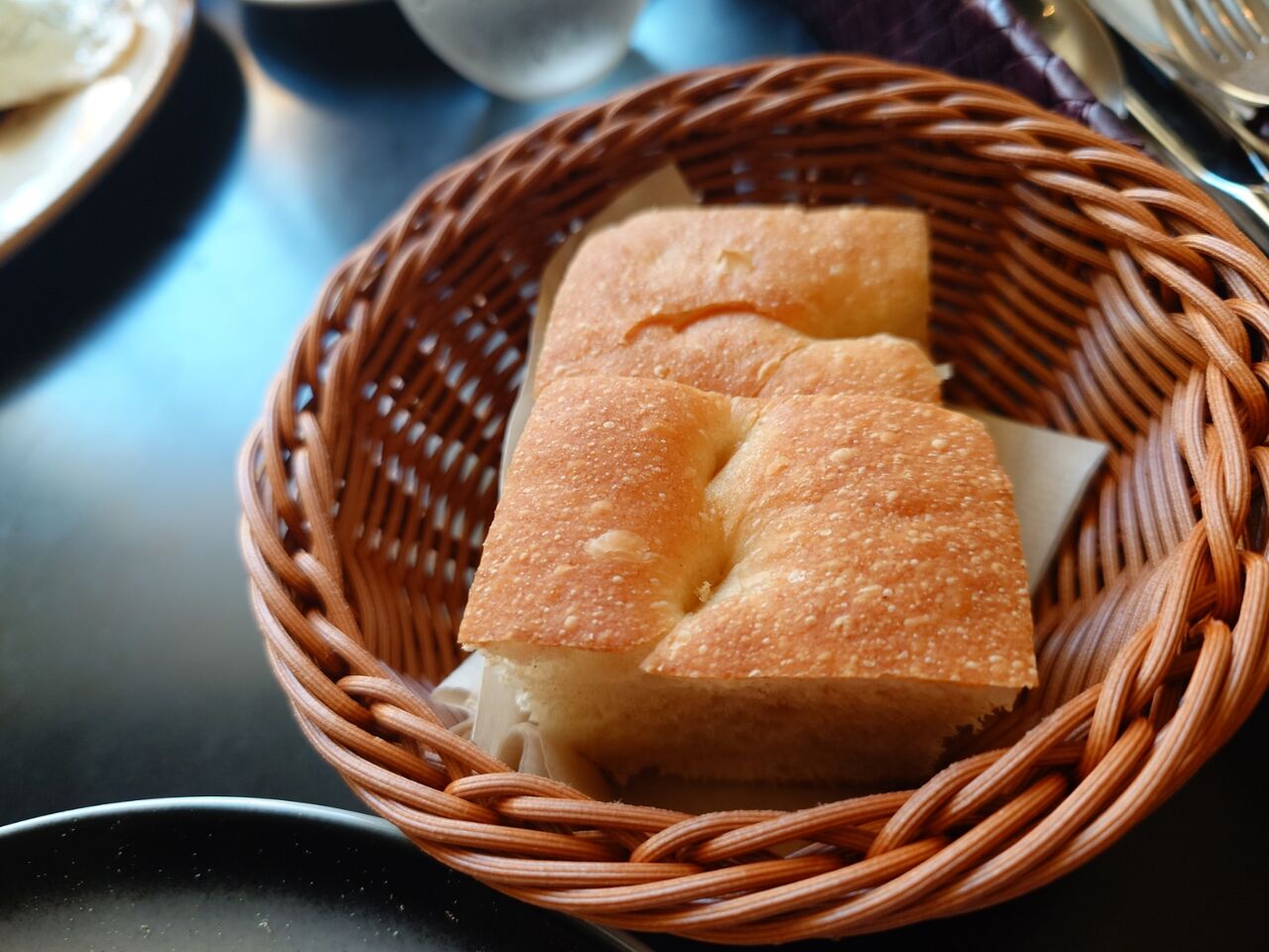 中央の大きなテーブルに置かれたパンは、かなり小さくカットされています。