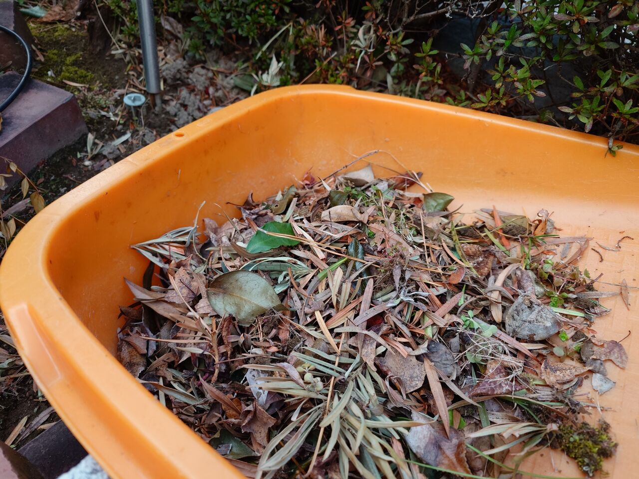 植木のあいだに落ちたホソバの葉なのでほうきで掃いて完了とはいかないので、いつものことながら、這いつくばって集めて回ります。
