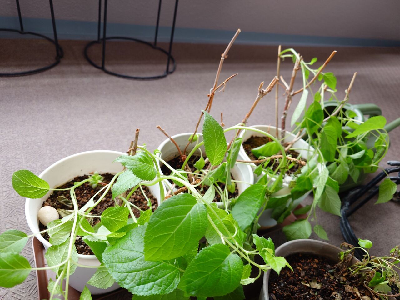 アナベルは、枯れるギリギリだったみたいで、3鉢がどれも脱力してるいたのだけど、手前が少し盛り返してきました。