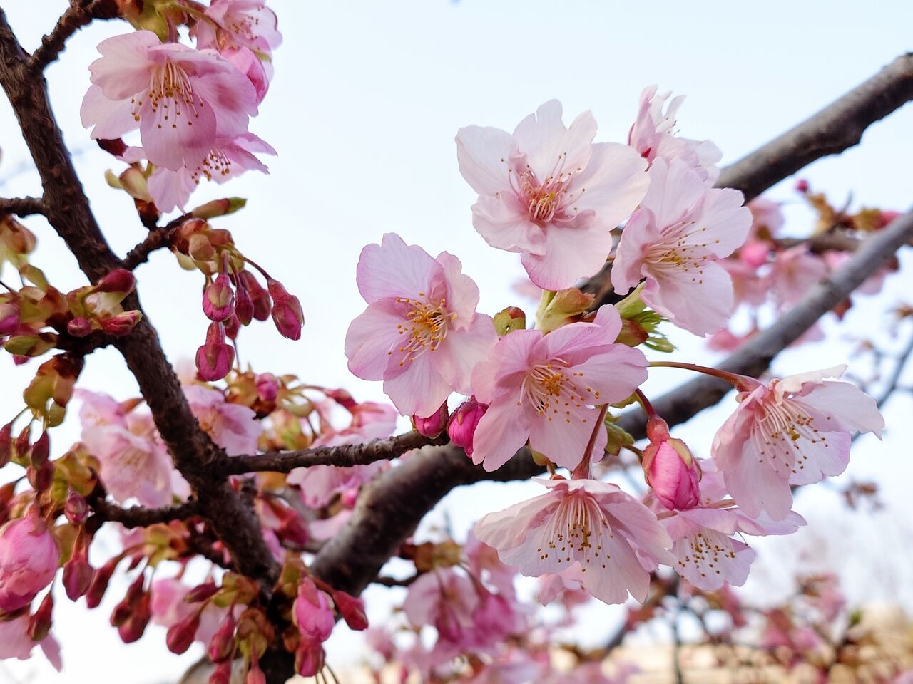 早咲きの桜は花が濃いピンクで、幹も黒っぽいです。