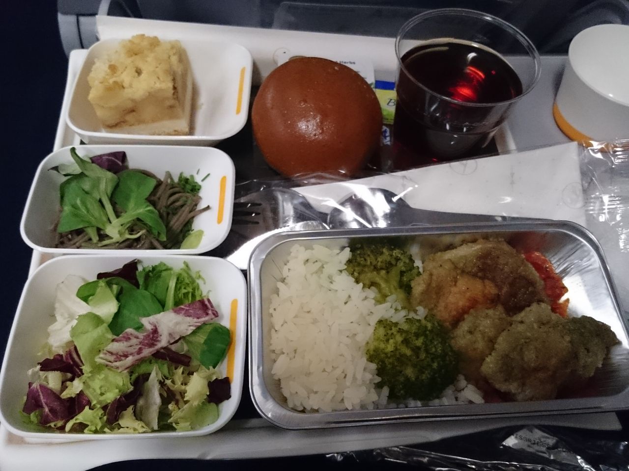 サラダ、お蕎麦、チキンとポレンタ(て、なに?)の紫カレーソース添えライス付き。デザートはブラウニーって書いてあったけど、リンゴのチーズケーキみたいな感じでした。