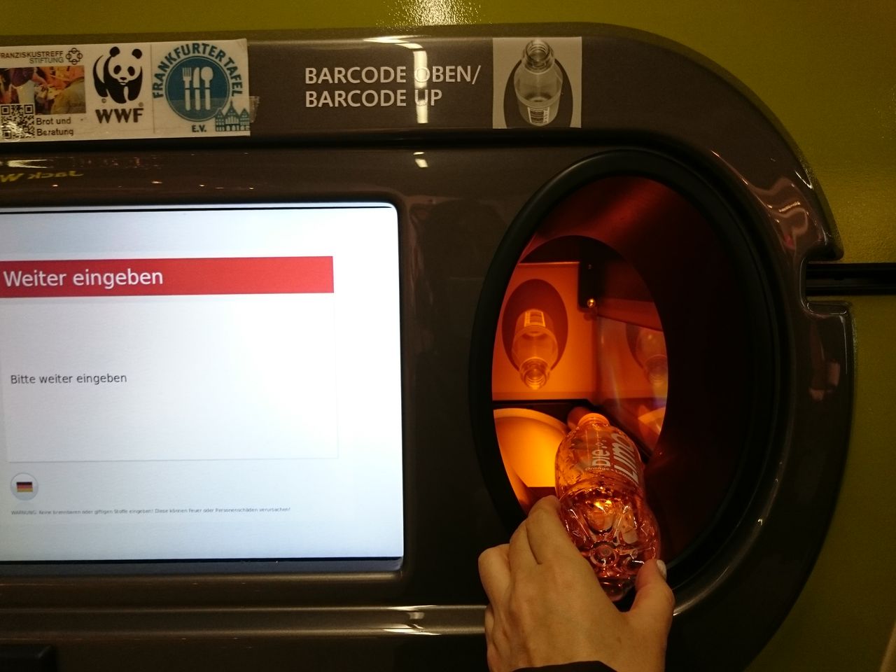 ただ、飲みながら空港まできたので、返すところがありません。どこかで捨てるしかないと思っていたら、空港にこういったデポ付きのバーコードがついてるボトルを入れると、その分寄付できる機械がありました。