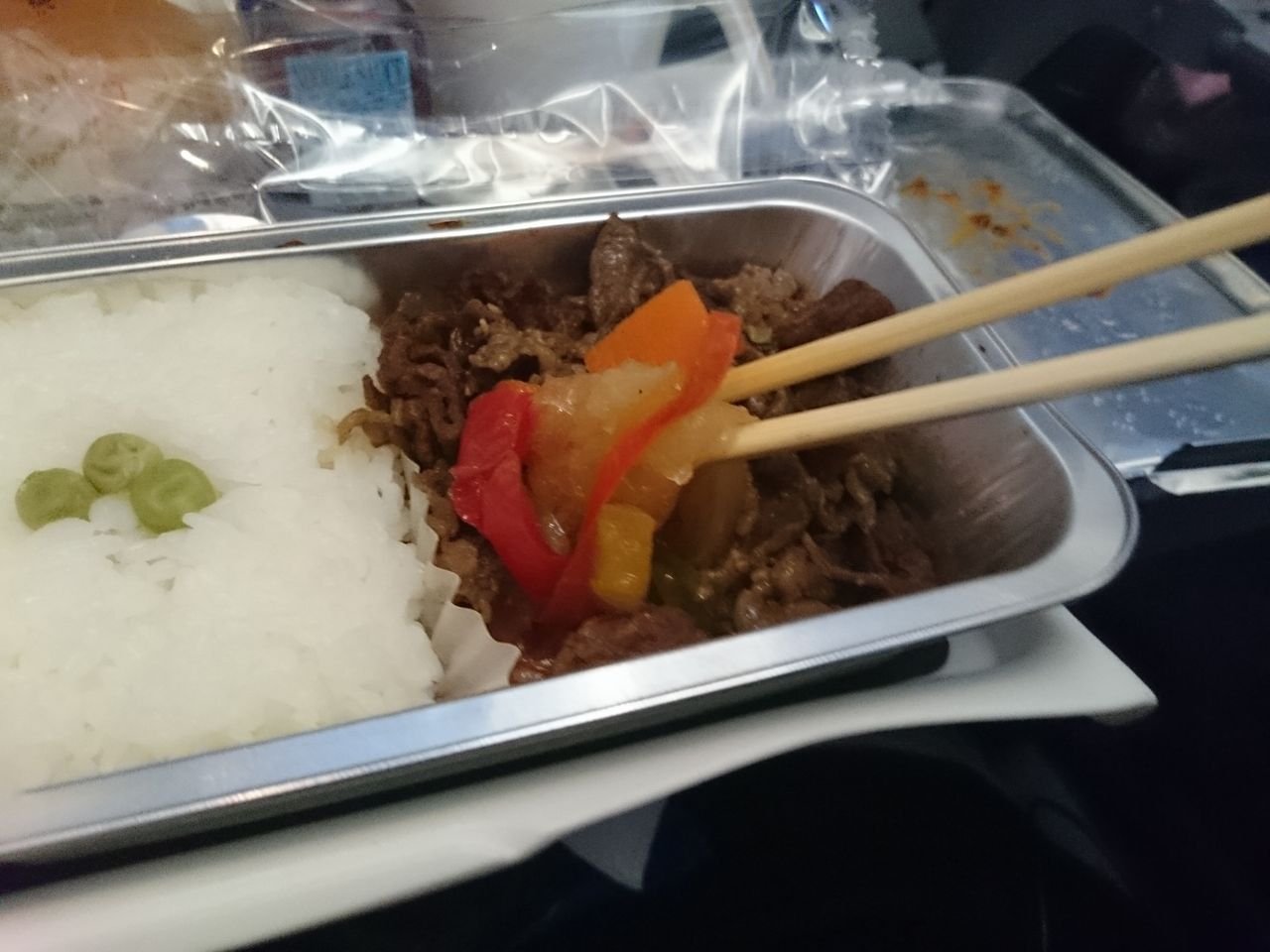 ビーフ焼肉の下にパプリカや玉ねぎがあって、お味はすき焼き風でした。