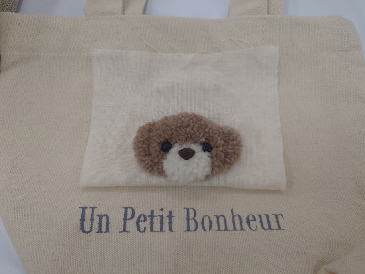 目の粗い布にクマちゃんの顔を毛糸でブスブス刺して、表面の毛糸をカットしたらくまちゃん部分のできあがり。