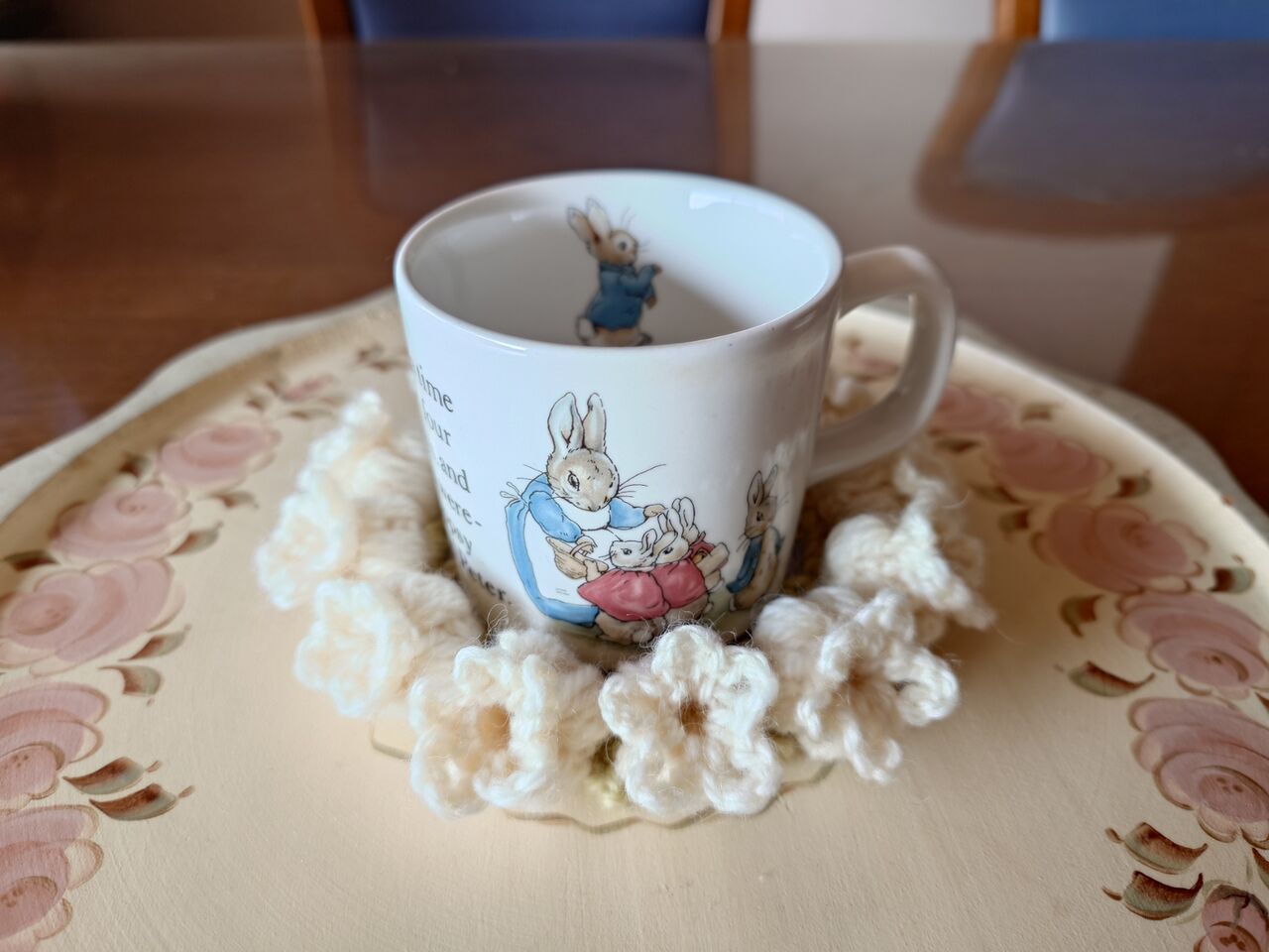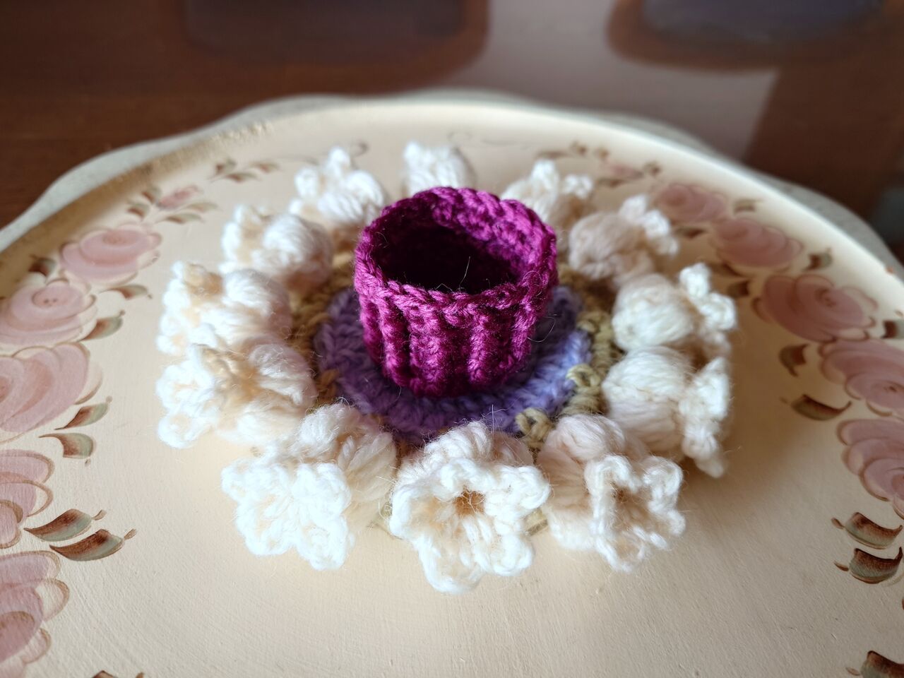 コースターとして使わない時には、カゴのように編んだ入れ物にさして、小さなブーケになります。