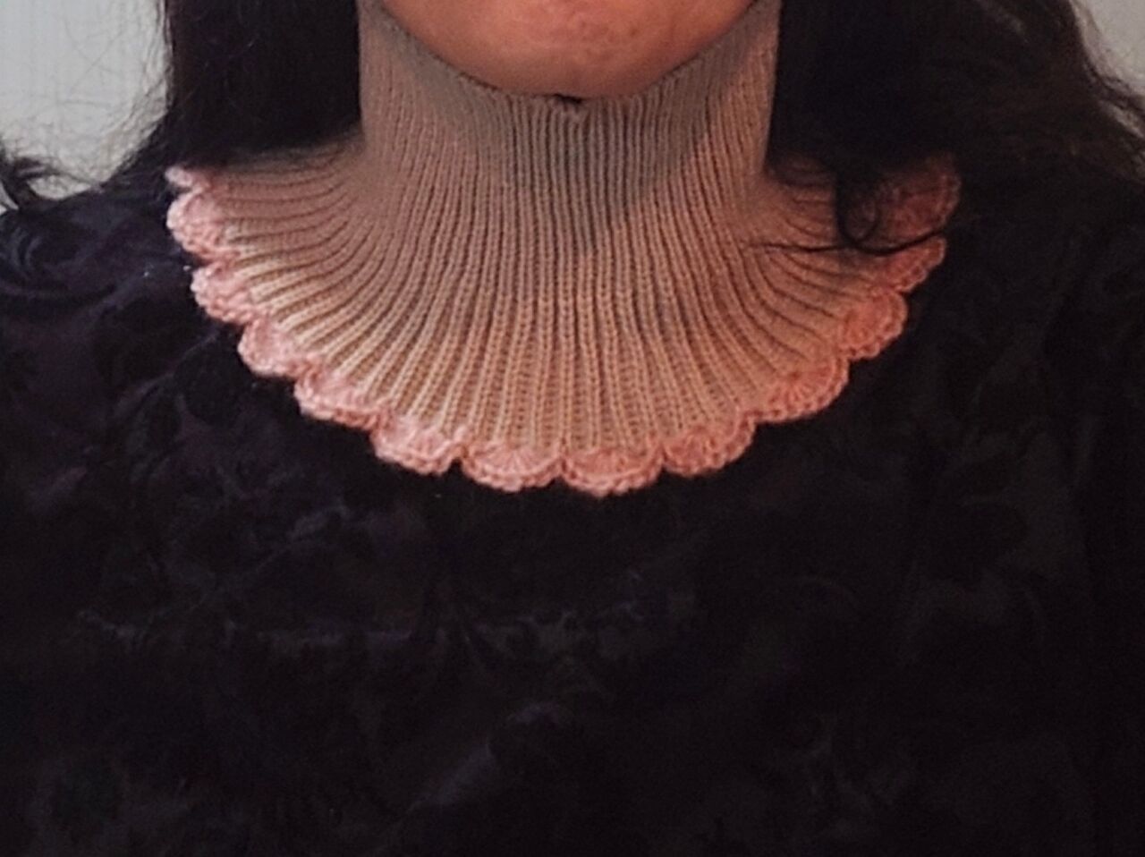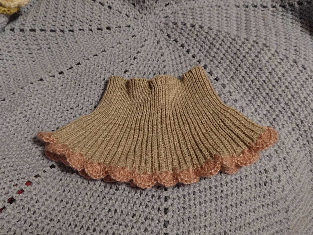 つけ襟のすそ(といってよいのかしら)にスカラップを編みました。