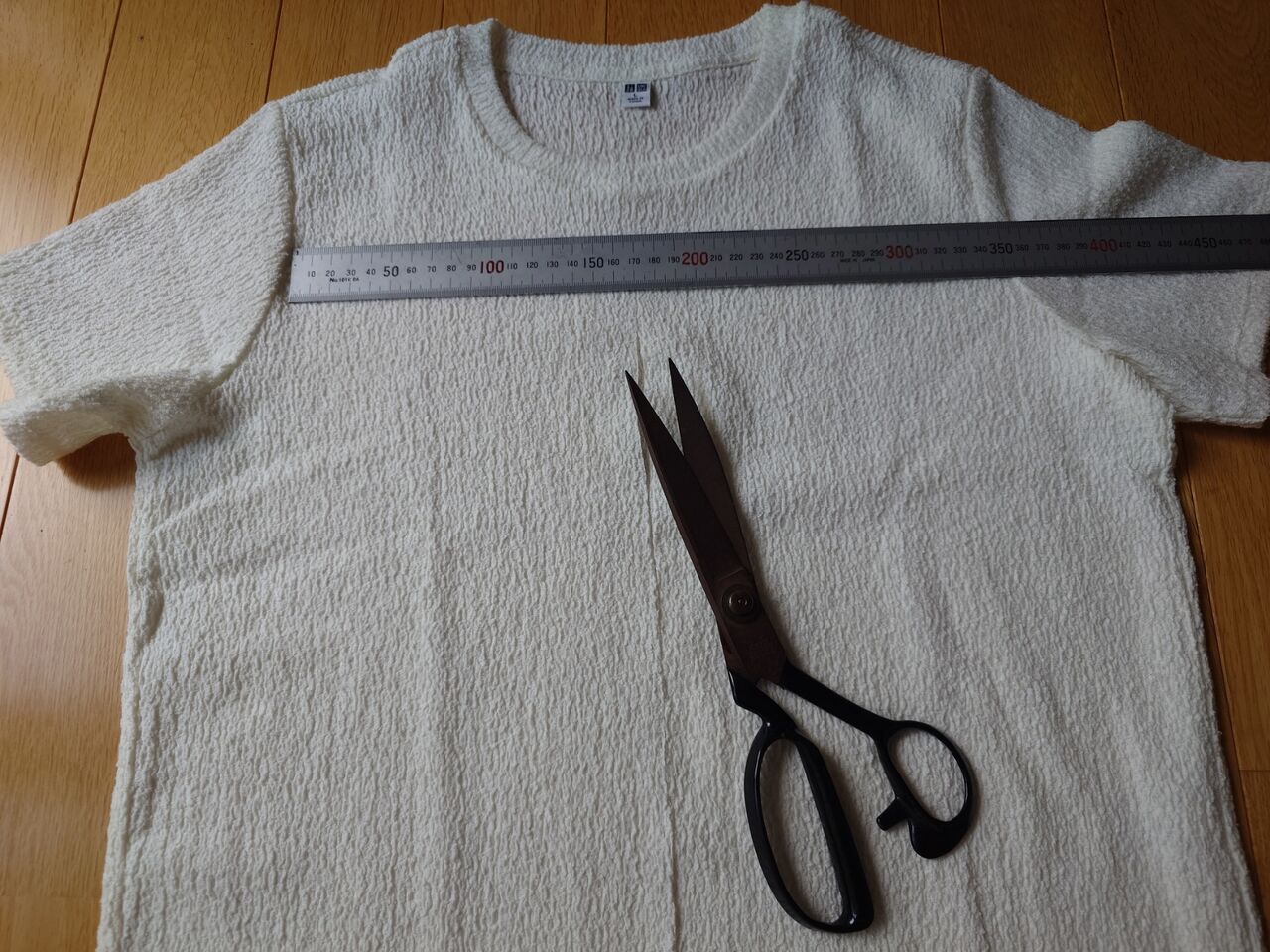 さて、この白いTシャツを真ん中からバサッとカットします。