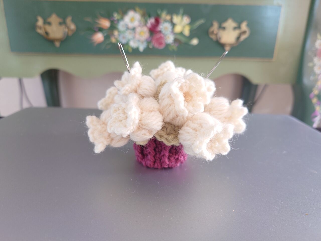 毛糸針をすぐに見失うので(普通の針と違ってそんなに危なくないから?針山がないから?)、針山代わりに、毛糸針を刺しています(笑)