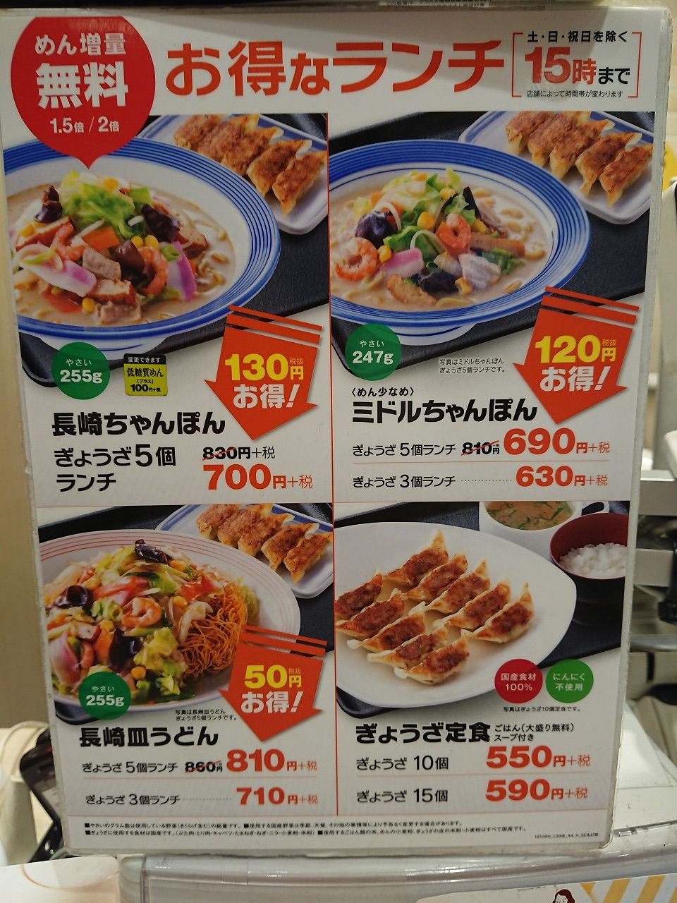 長崎ちゃんぽんと餃子のセットは¥690(税抜)で¥10安くなっていました。