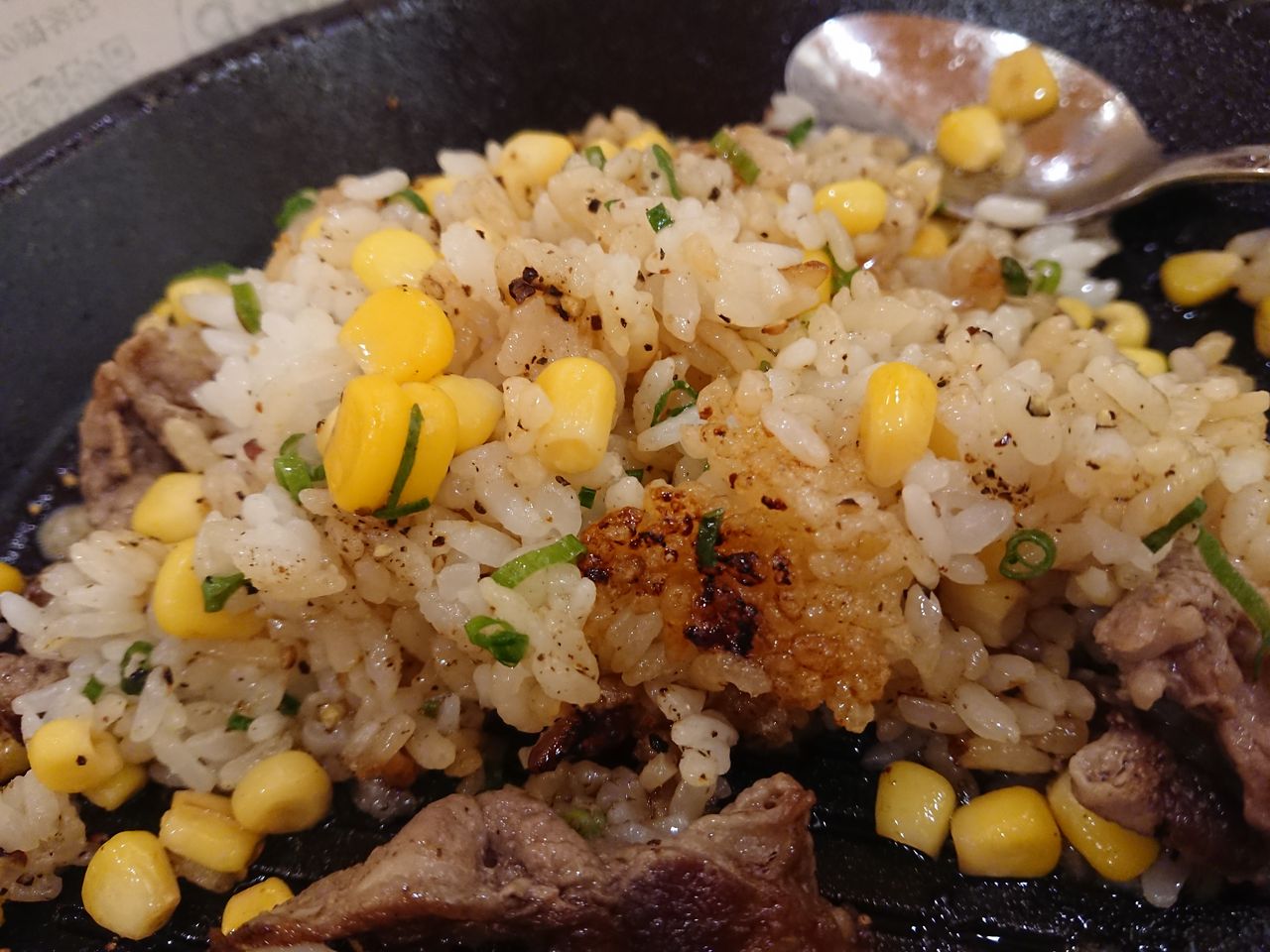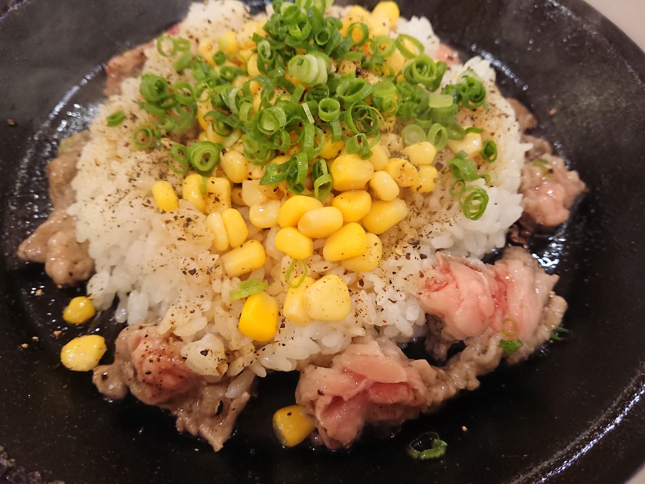 熱々にした鉄皿にごはんをのせ、ペッパーをふってコーンと刻み葱をたっぷりトッピング。その周りに生のお肉を置いた状態で、トレーを手渡されます。