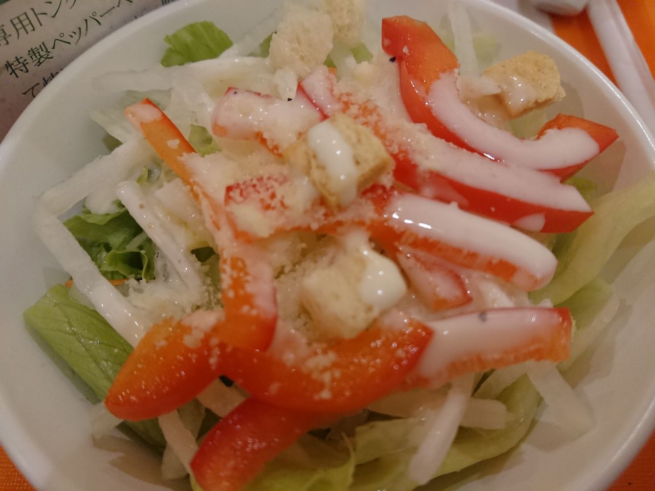 フードコートのお店のサラダって野菜がしなっとして、元気がないことが多いのですが、これはレタスもパリッとして思った以上にちゃんとしたサラダでした
