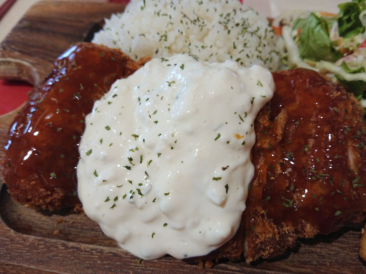甘辛ソースがよくからんでる上にタルタルソースがかかっています。
