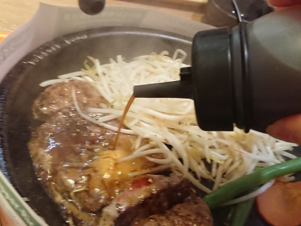 ジュージューと鉄板で焼かれているので、飛び跳ね防止の紙の囲いがついてます。