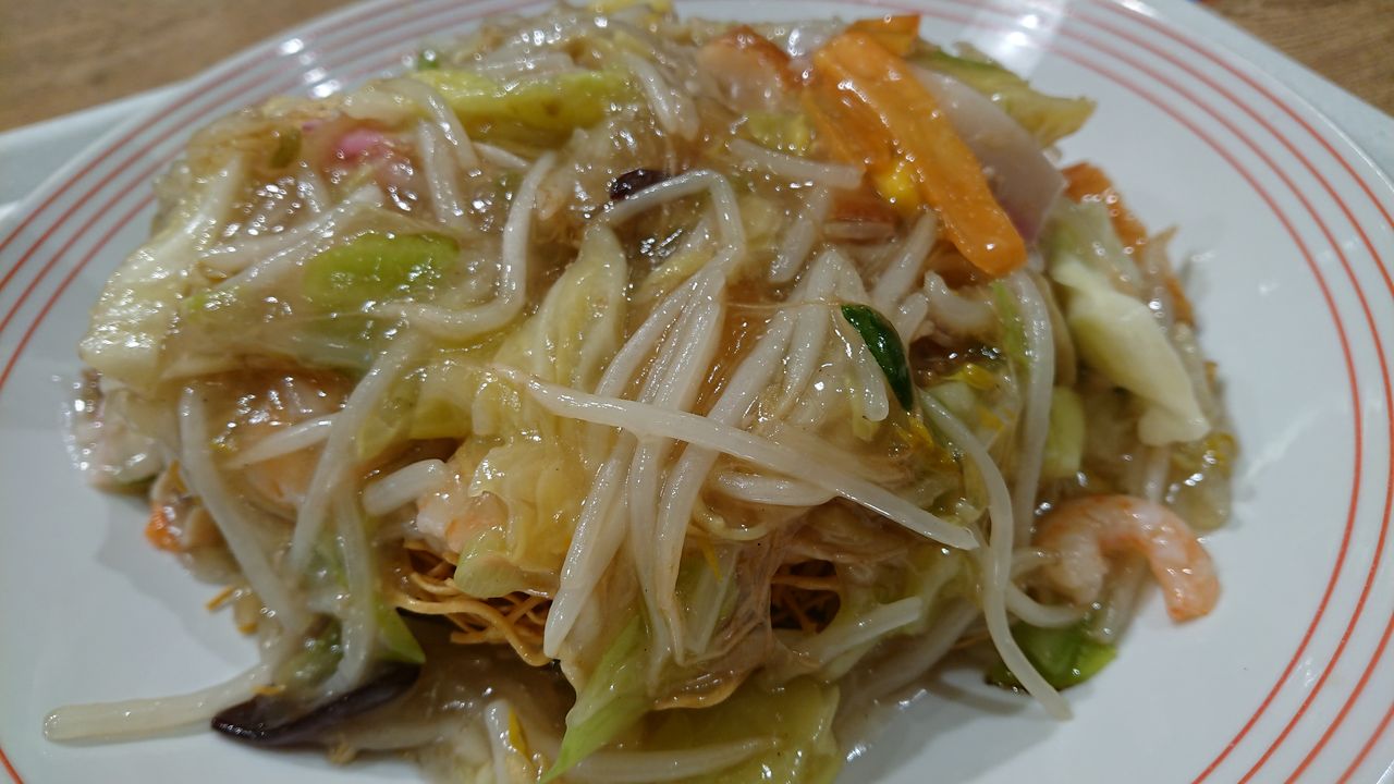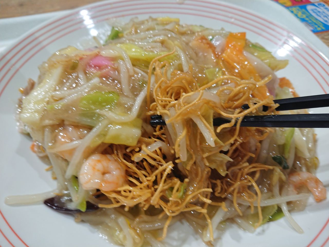 皿うどんて、こんなに細麺なんですね。それともリンガーハットの皿うどんだからでしょうか?初めてなので、わかりません