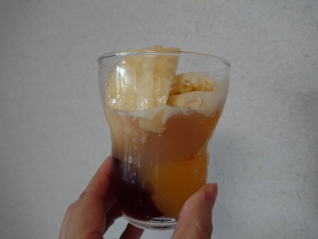 白桃と、オレンジ、巨峰のゼリーをシェアして、その上にアイスクリームと桃を乗せました。